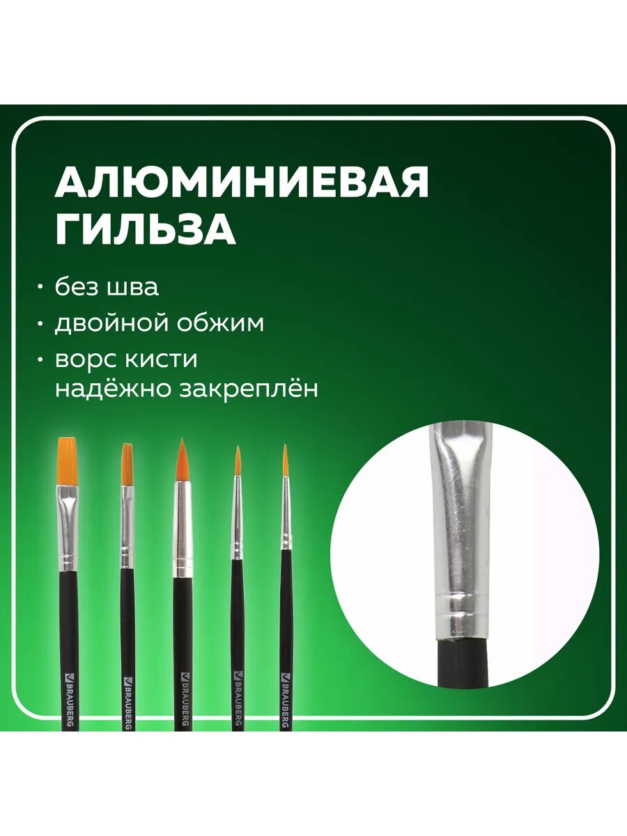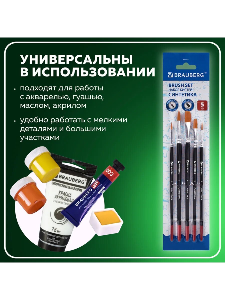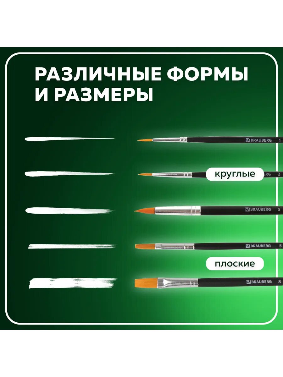 Кисти / кисточки для акварели, гуаши для рисования Brauberg, набор 5 штук (синтетика, круглые № 1, 2, 5, плоские № 5, 8), блистер, 200219
