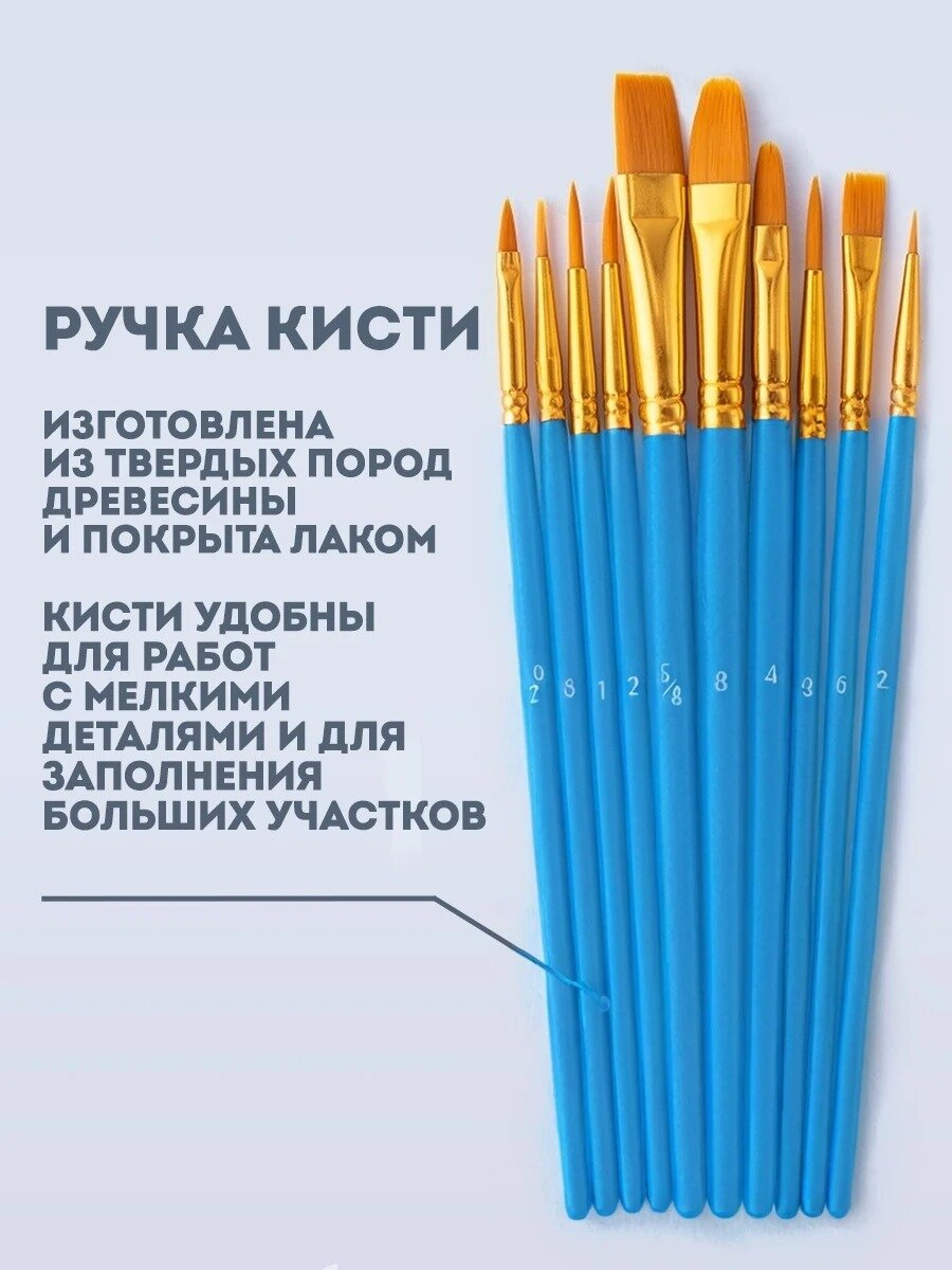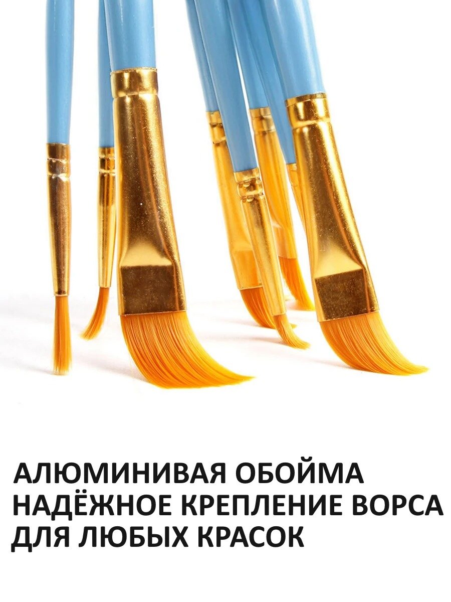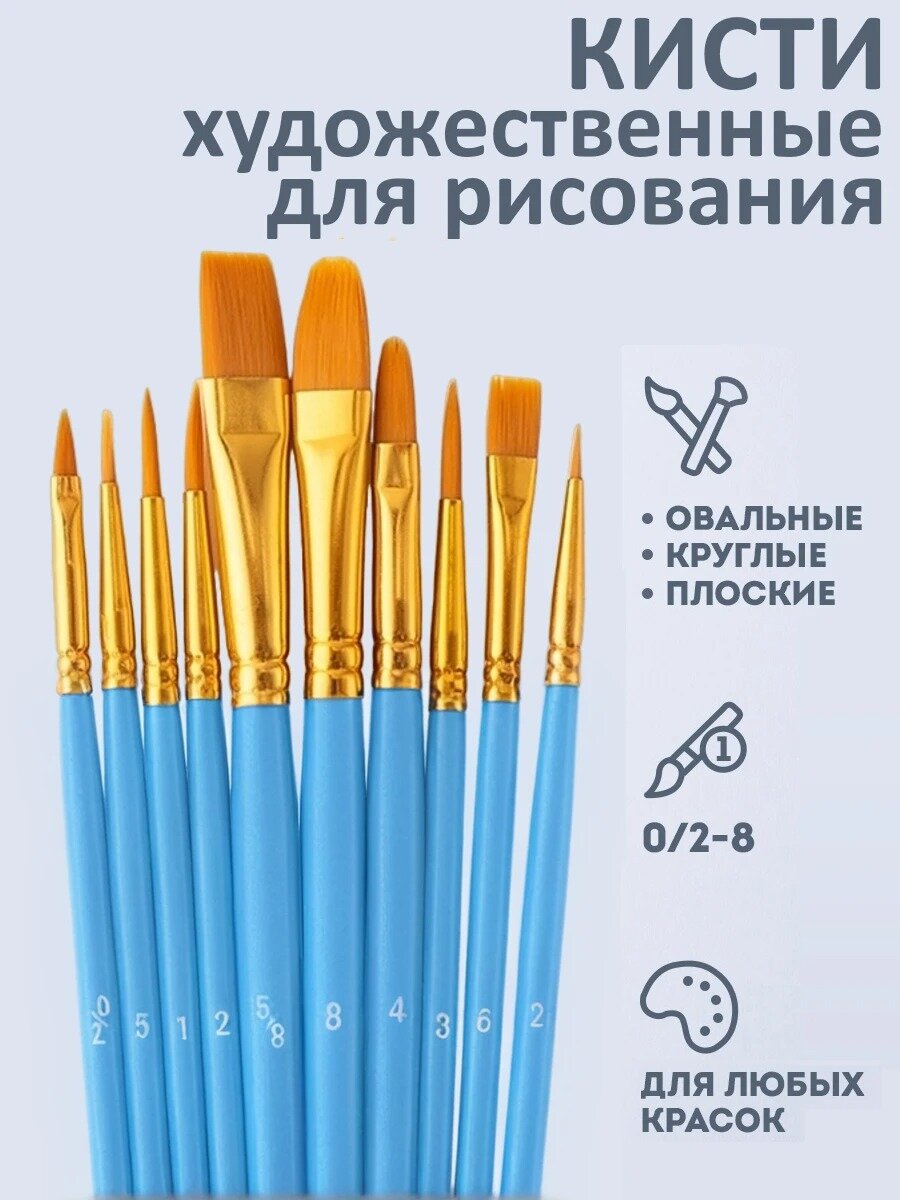 Купить Кисти художественные для рисования и творчества, набор 10шт, синтетика. Для акварели, акрила, масляных красок, гуаши. Голубой цвет.