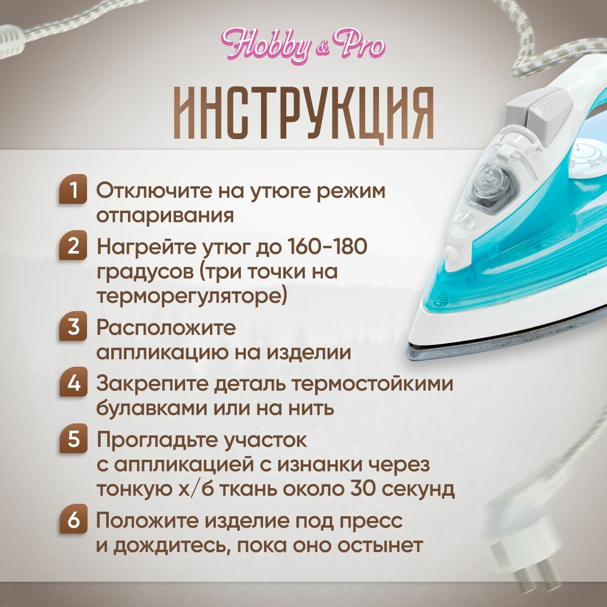 | Дополнительная информация | инструкция: установите утюг на отметку max, расположите аппликацию на изделии и прогладьте ткань с лицевой и изнаночной стороны; чтобы не повредить рисунок, проглаживайте аппликацию через тонкую х/б ткань; готовое изделие можно стирать при температуре не выше 40 градусов |