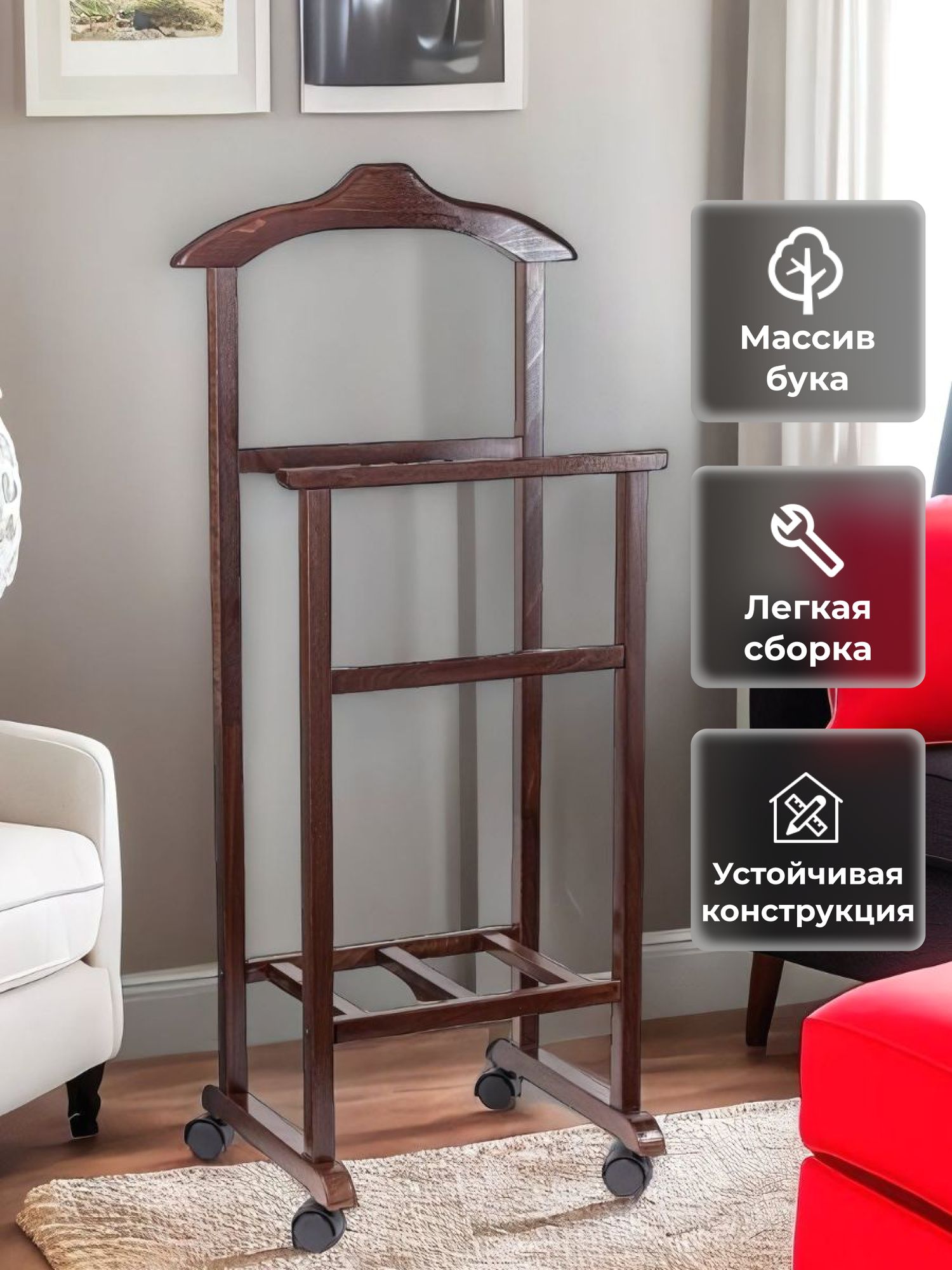 Вешалка напольная для одежды деревянная на колесах для одежды Голд с полочкой для обуви орех интересное: