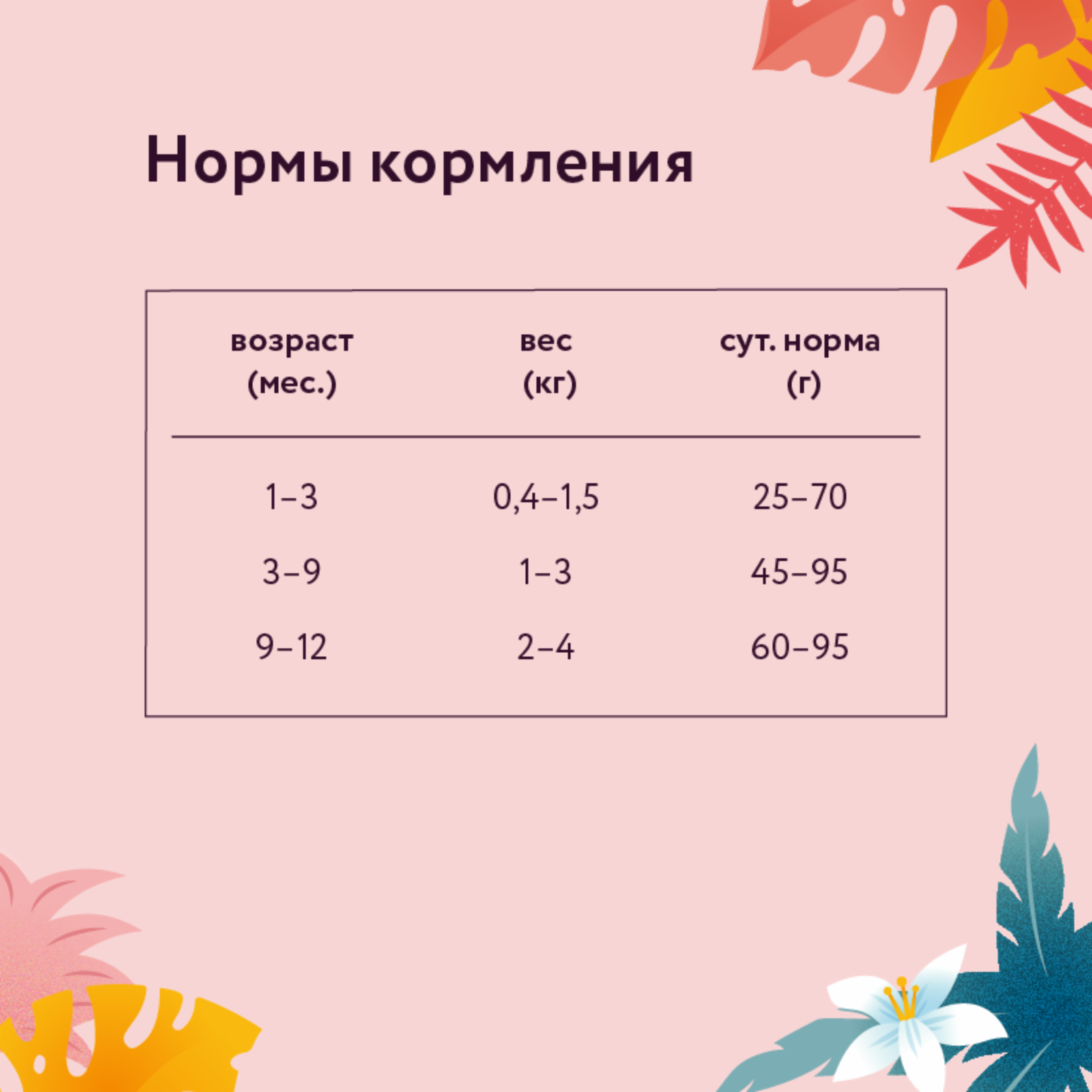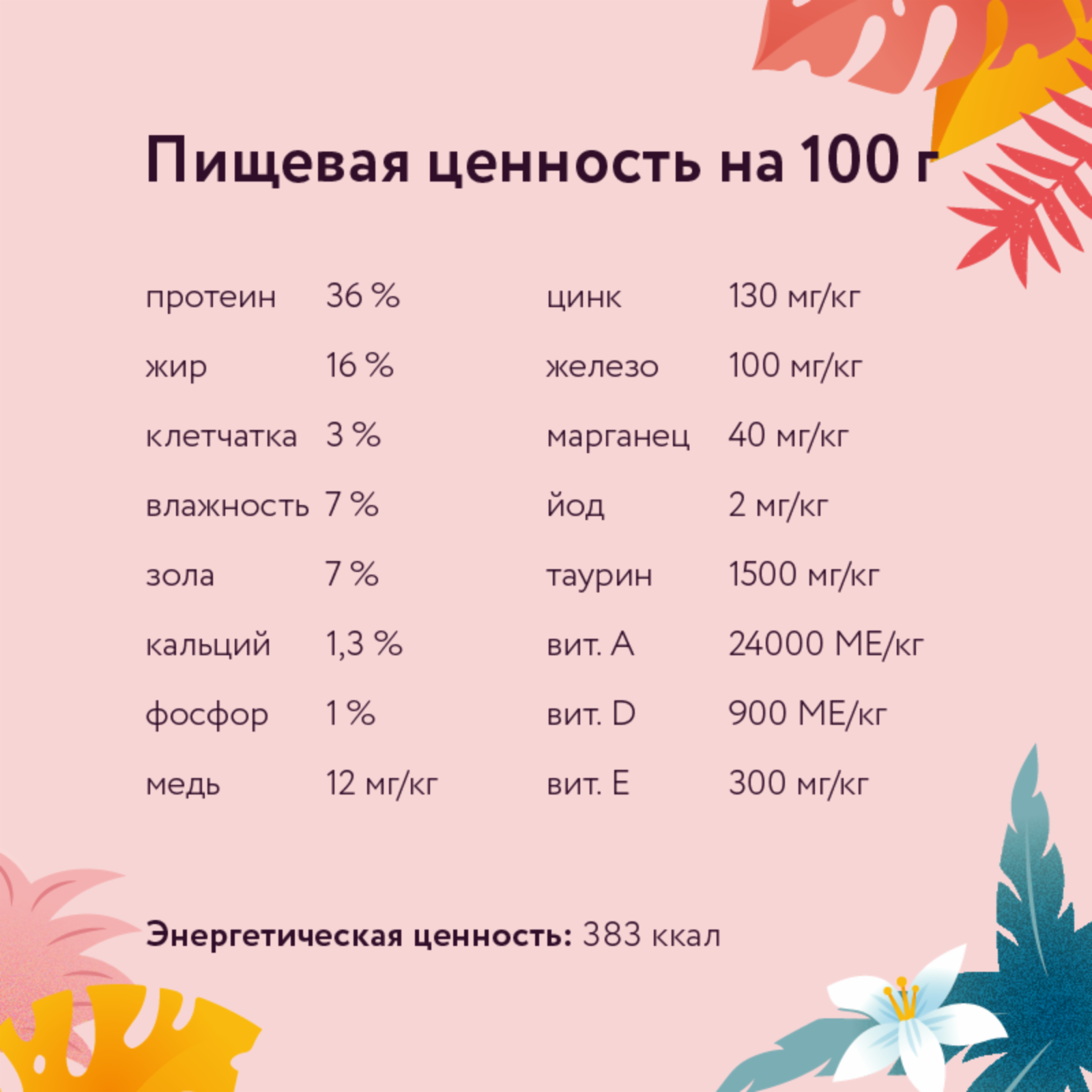 | Дозировка | В зависимости от активности и аппетита вашего питомца |