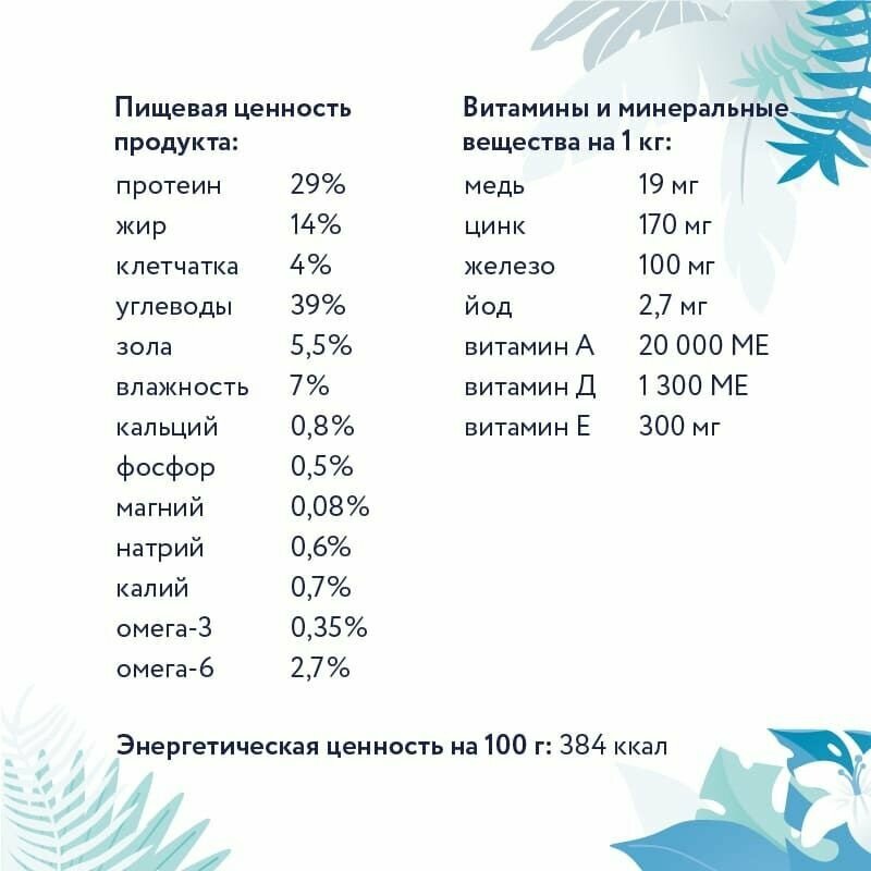 | Минеральные вещества | кальций 0,7%, фосфор 0,6%, магний 0,055%, натрий 0,6%, калий 0,6%, медь 18 мг/кг, цинк 160 мг/кг, железо 100 мг/кг, йод 1,5 мг/кг |