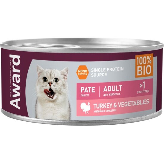 Влажный корм AWARD для взрослых кошек паштет из индейки с овощами 100г * 16 шт