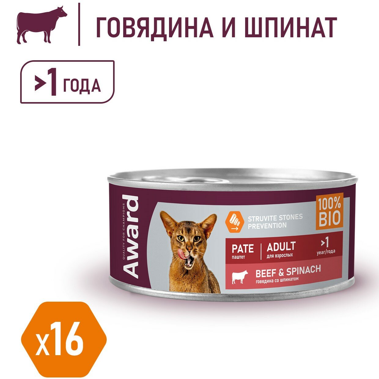Влажный корм AWARD для кошек паштет из говядины 100г * 16 шт