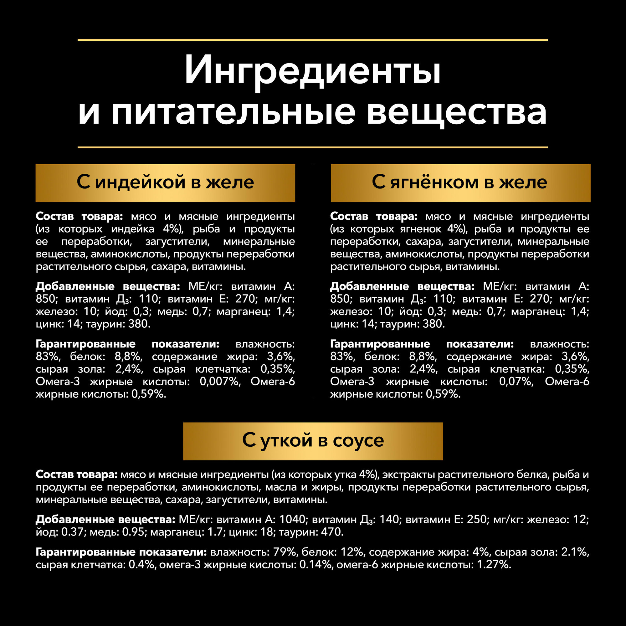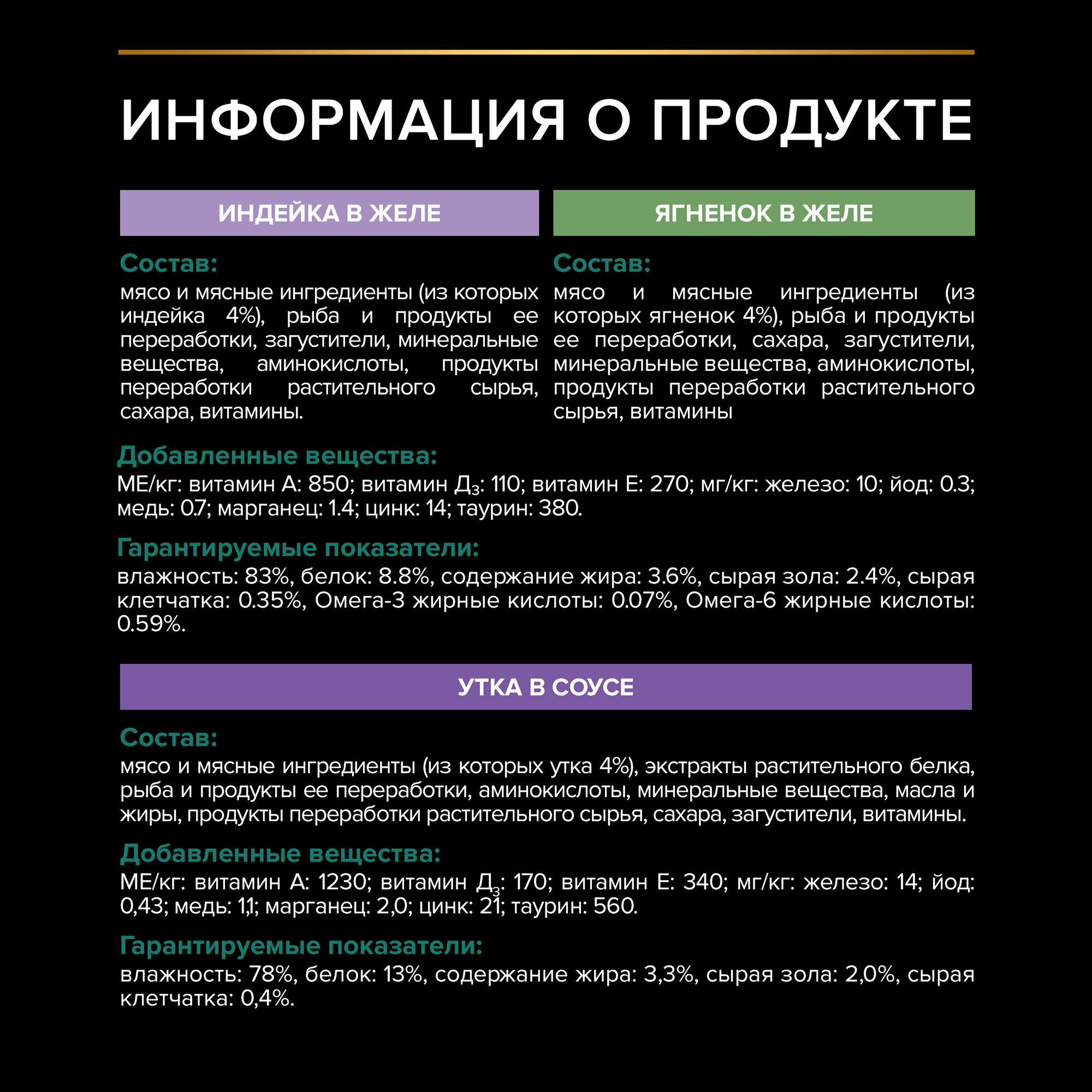 | Витамины | 1. PURINA® PRO PLAN® NUTRISAVOUR® (ПУРИНА ПРО ПЛАН НУТРИСЭЙВОР) Корм консервированный полнорационный для взрослых кошек, вкусные кусочки с индейкой, в желе. Добавленные вещества: МЕ/кг: витамин А: 850; витамин Д₃: 110; витамин E: 270; мг/кг: железо: 10; йод: 0,3; медь: 0,7; марганец: 1,4; цинк: 14; таурин: 380. 2. PURINA® PRO PLAN® NUTRISAVOUR® (ПУРИНА ПРО ПЛАН НУТРИСЭЙВОР) Корм консервированный полнорационный для взрослых кошек, нежные кусочки с уткой, в соусе. Добавленные вещества: МЕ/кг: витамин А: 1040; витамин Д₃: 140; витамин E: 250; мг/кг: железо: 12; йод: 0.37; медь: 0.95; марганец: 1.7; цинк: 18; таурин: 470. 3. PURINA® PRO PLAN® NUTRISAVOUR®(ПУРИНА ПРО ПЛАН НУТРИСЭЙВОР) Корм консервированный полнорационный для взрослых кошек, вкусные кусочки с ягненком, в желе. Добавленные вещества: МЕ/кг: витамин А: 850; витамин Д₃: 110; витамин E: 270; мг/кг: железо: 10; йод: 0.3; медь: 0.7; марганец: 1.4; цинк: 14; таурин: 380. |