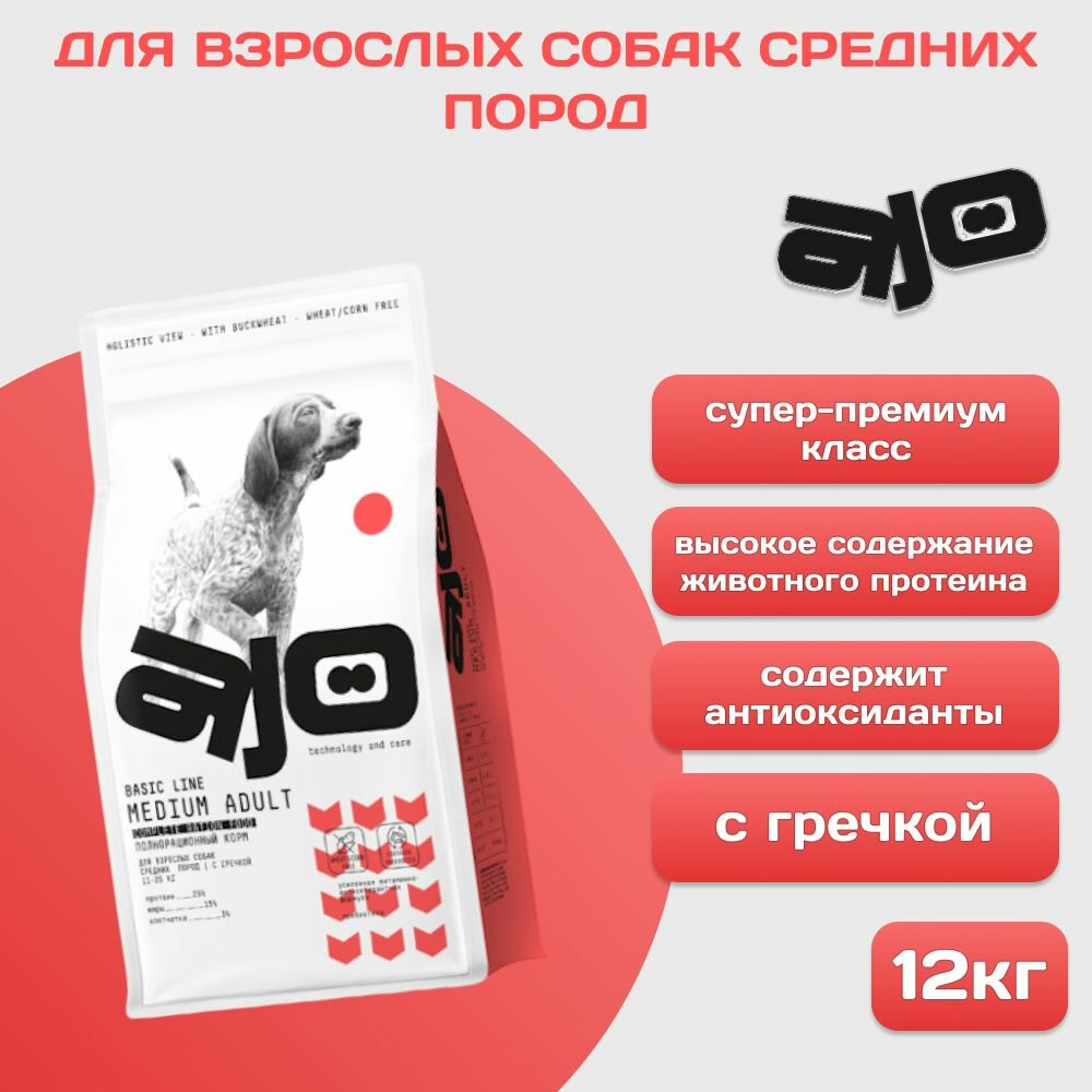 Купить Сухой полнорационный корм AJO Dog Medium Adult для взрослых собак средних пород с гречкой, 12кг