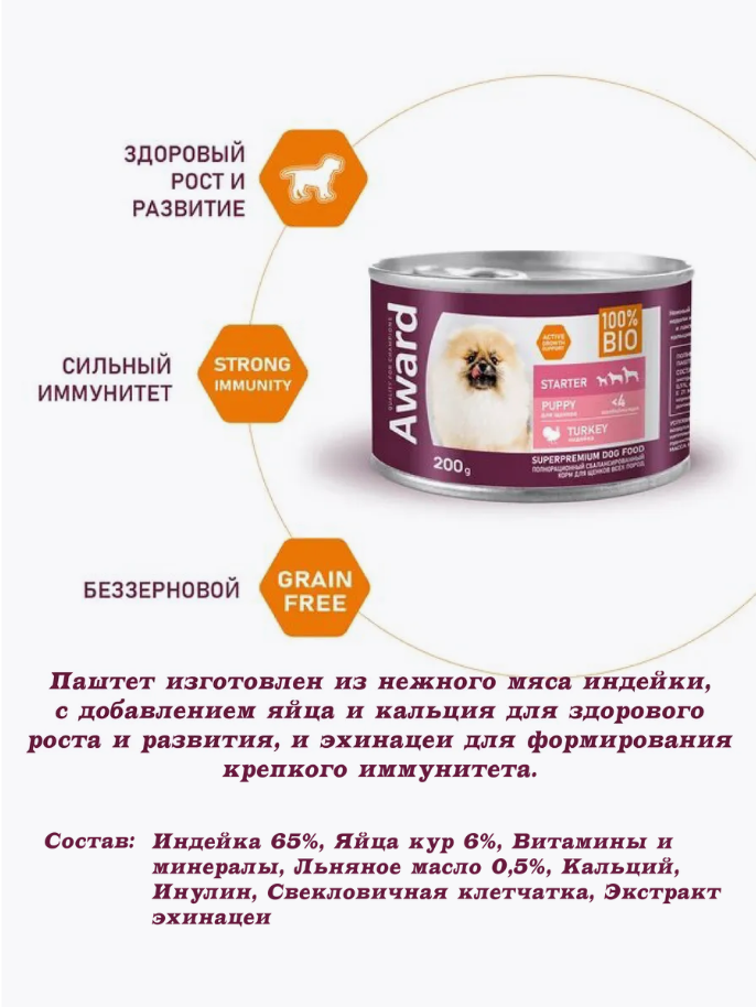 Влажный корм AWARD для щенков с начала прикорма до 4 месяцев, беременных и кормящих сук паштет из индейки 200г х 3шт