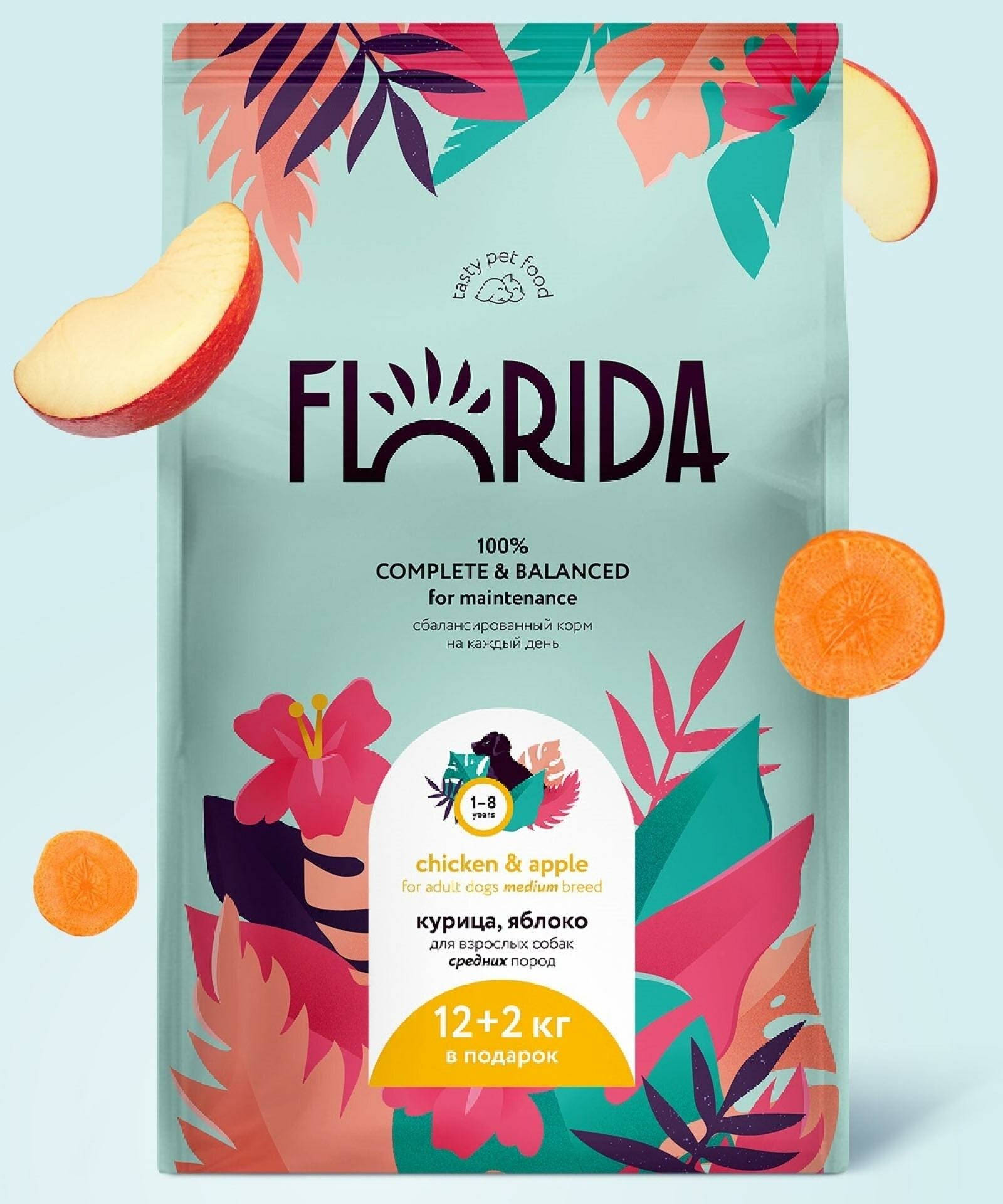 FLORIDA для взрослых собак средних пород с курицей и яблоком (12 + 2 кг)