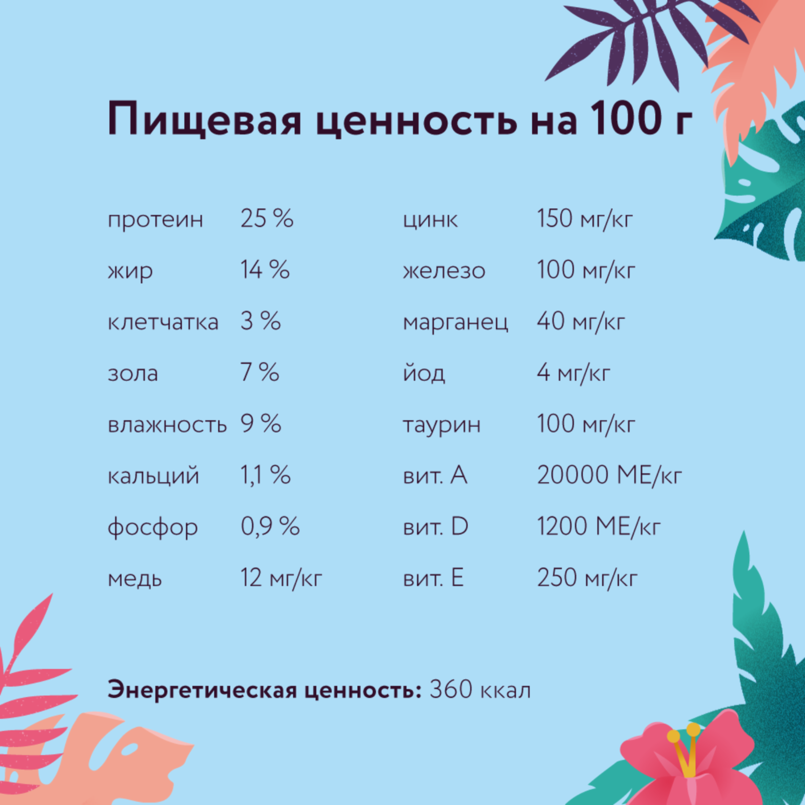 | Минеральные вещества | -цинк 150 мг/кг -железо 100 мг/кг -марганец 40 мг/кг -йод 4 мг/кг -таурин 100 мг/кг |