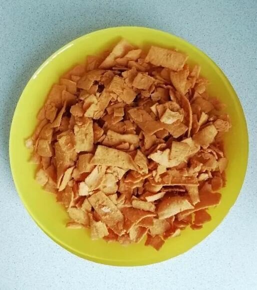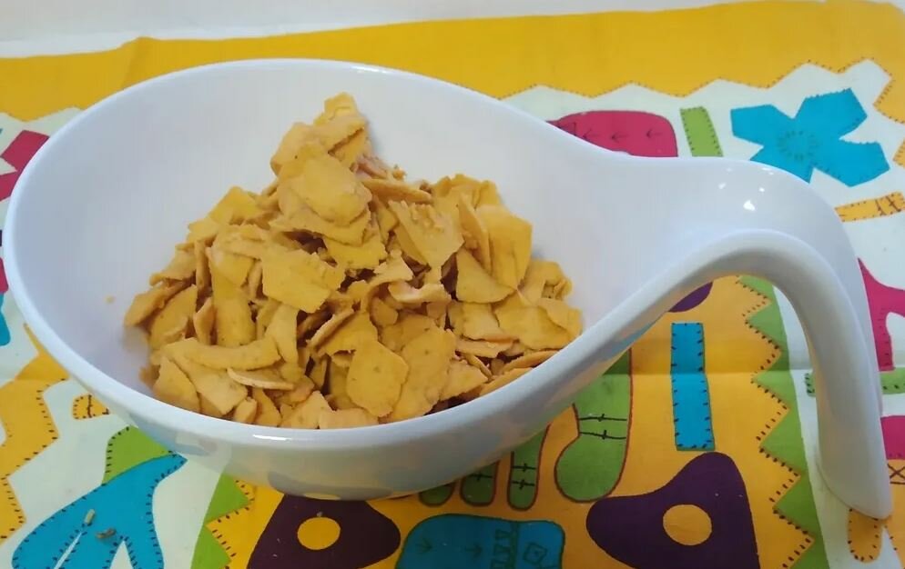 | Состав | картофель (51,4%), рафинированное пальмолеиновое масло, рисовая мука, специи и приправы (11,8%) (луковый порошок, молотый зеленый перец чили, сухой порошок манго, молотый желтый перец чили, молотый кумин, порошок кориандра, молотый черный перец, мятный порошок, куркума, чесночный порошок, анисовый порошок, дрожжевой экстракт), кукурузный крахмал, нутовая мука, мука из очищенных бобов вигны борцелистной, йодированная соль, сырный порошок, лимонная кислота (E330) и яблочная кислота (E296) в качестве регуляторов кислотности, динатрия 5’-рибонуклеотид (E635) в качестве усилителя вкуса. Содержит искусственный пищевой краситель [E110 Желтый «солнечный закат»] и ароматизаторы, идентичные натуральным. Содержит аллергены: молоко. Пищевая добавка E110 может вызывать гиперактивность и нарушение внимания у детей. Продукт может содержать следы пшеницы, арахиса, орехов, кунжута, сои и овса |