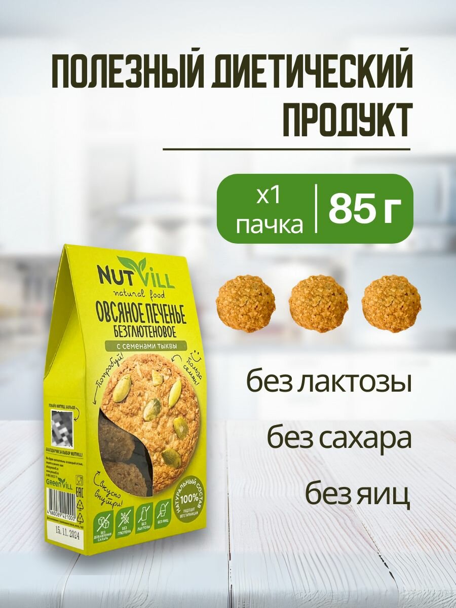 Печенье овсяное безглютеновое "С семенами тыквы" без сахара Nutvill, 85 гр (2 шт. в наборе)