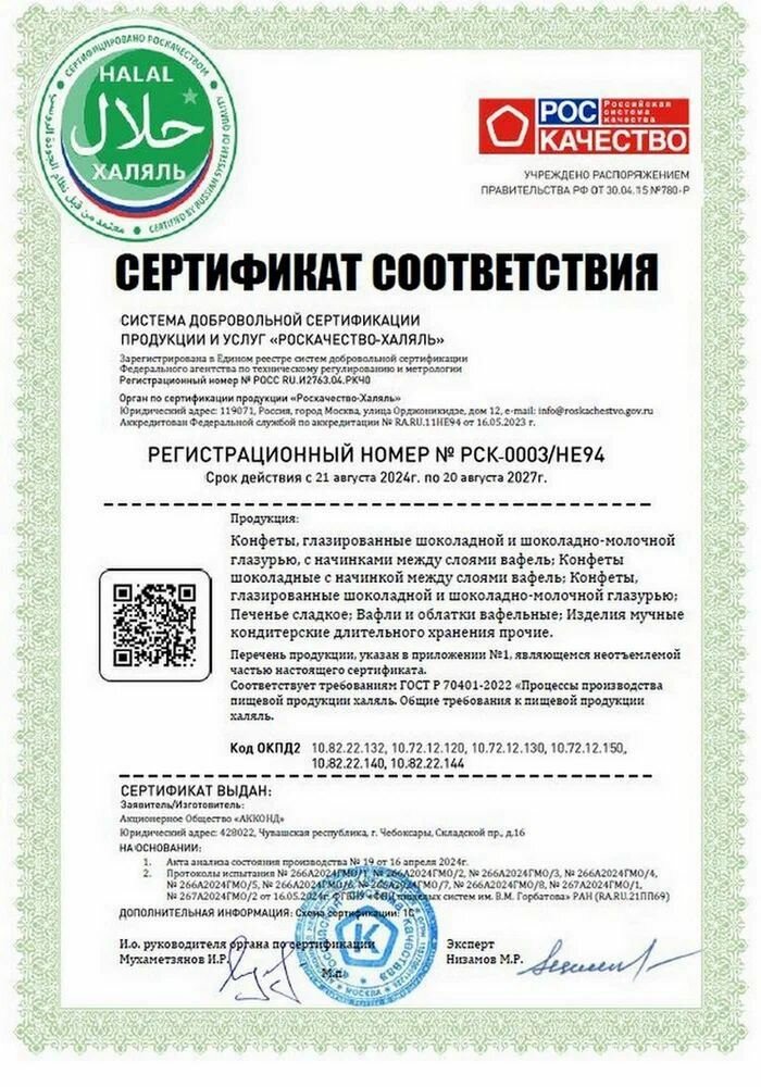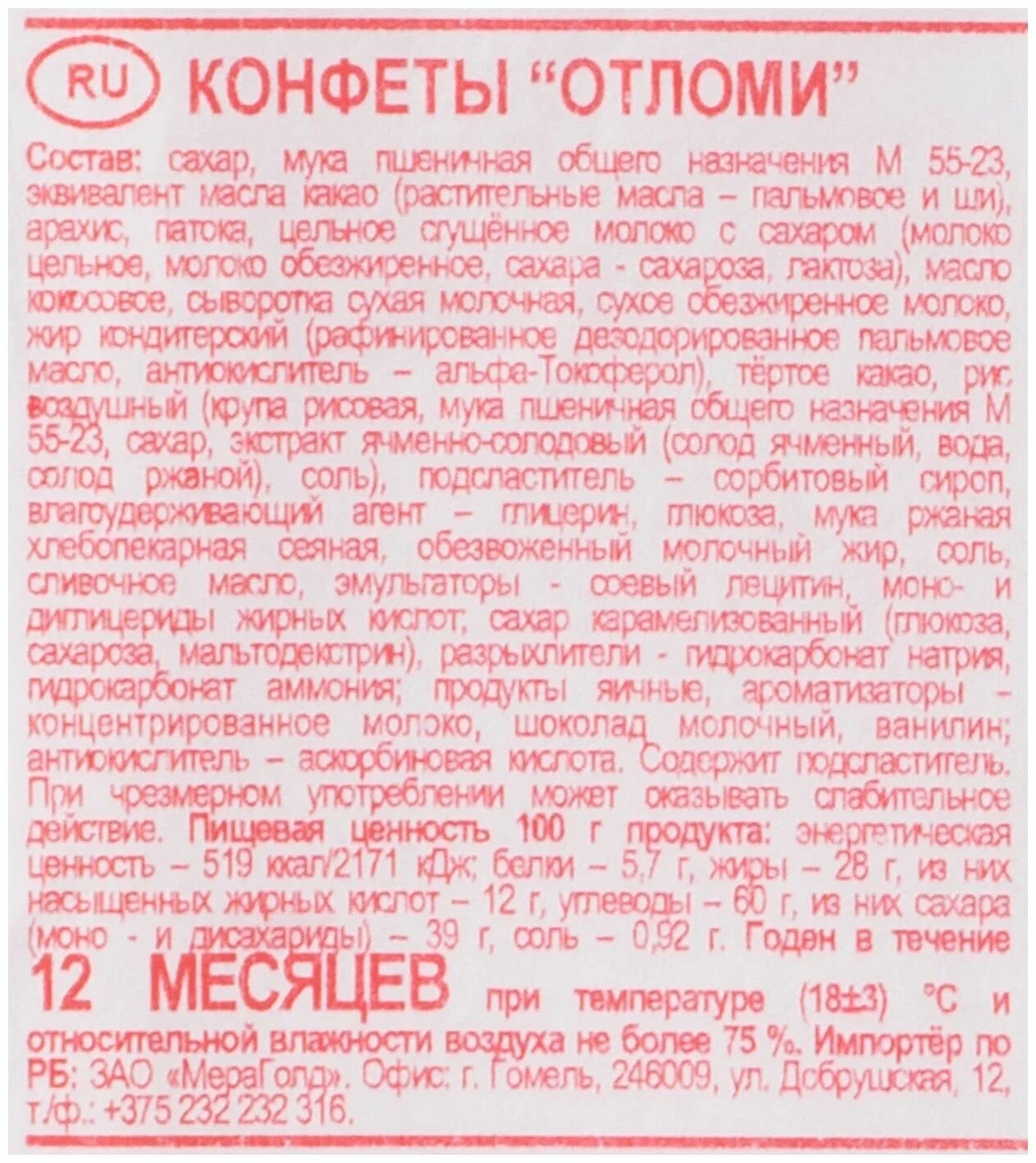 | Состав | сахар, мука пшеничная общего назначения М 55-23, жир кондитерский (рафинированное дезодорированное растительное масло, антиокислитель - альфа-Токоферол), заменитель масла какао (рафинированное дезодорированное растительное масло, эмульгаторы – сорбитан тристеарат), сыворотка сухая молочная, арахис, орех фундук, лактоза, какао порошок, сухое обезжиренное молоко, обезвоженный молочный жир, эмульгатор - соевый лецитин, продукты яичные, концентрат (экстракт) ячменно-солодовый (солод ячменный пивоваренный светлый – ячмень, вода), крахмал кукурузный, соль, разрыхлители - гидрокарбонат натрия, гидрокарбонат аммония; масло кокосовое, ароматизаторы – сливки, ванилин; антиокислитель – аскорбиновая кислота |