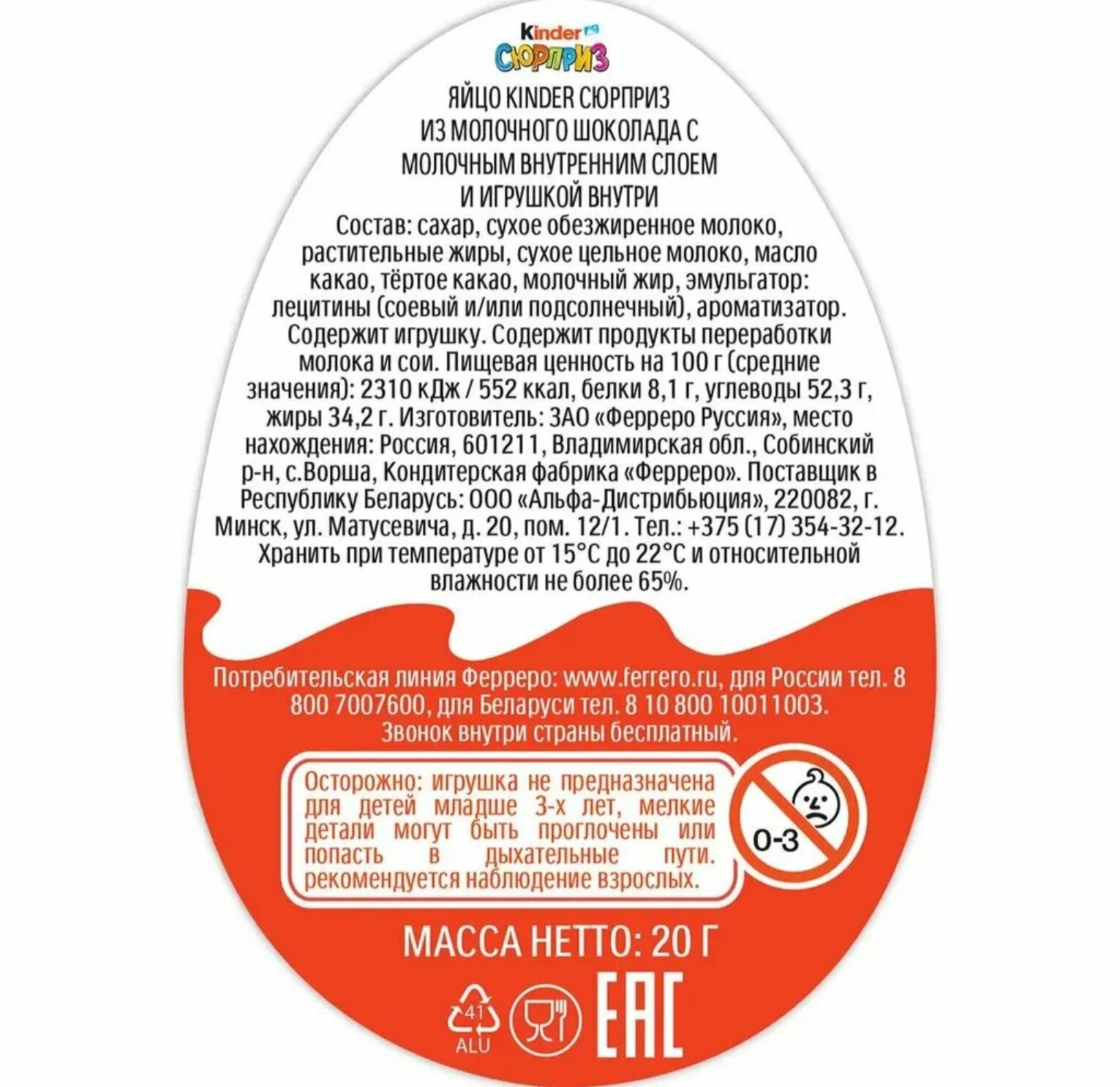 | Состав | Уникальная рецептура с высоким содержанием молочных ингредиентов (32%) разработана специально для детей, а игрушки из каждой серии производятся из безопасных для детей материалов. Состав: сахар, сухое обезжиренное молоко, растительные жиры, сухое цельное молоко, масло какао, тёртое какао, молочный жир, эмульгатор: лецитины (соевый и/или подсолнечный), ароматизатор. Содержит игрушку. |