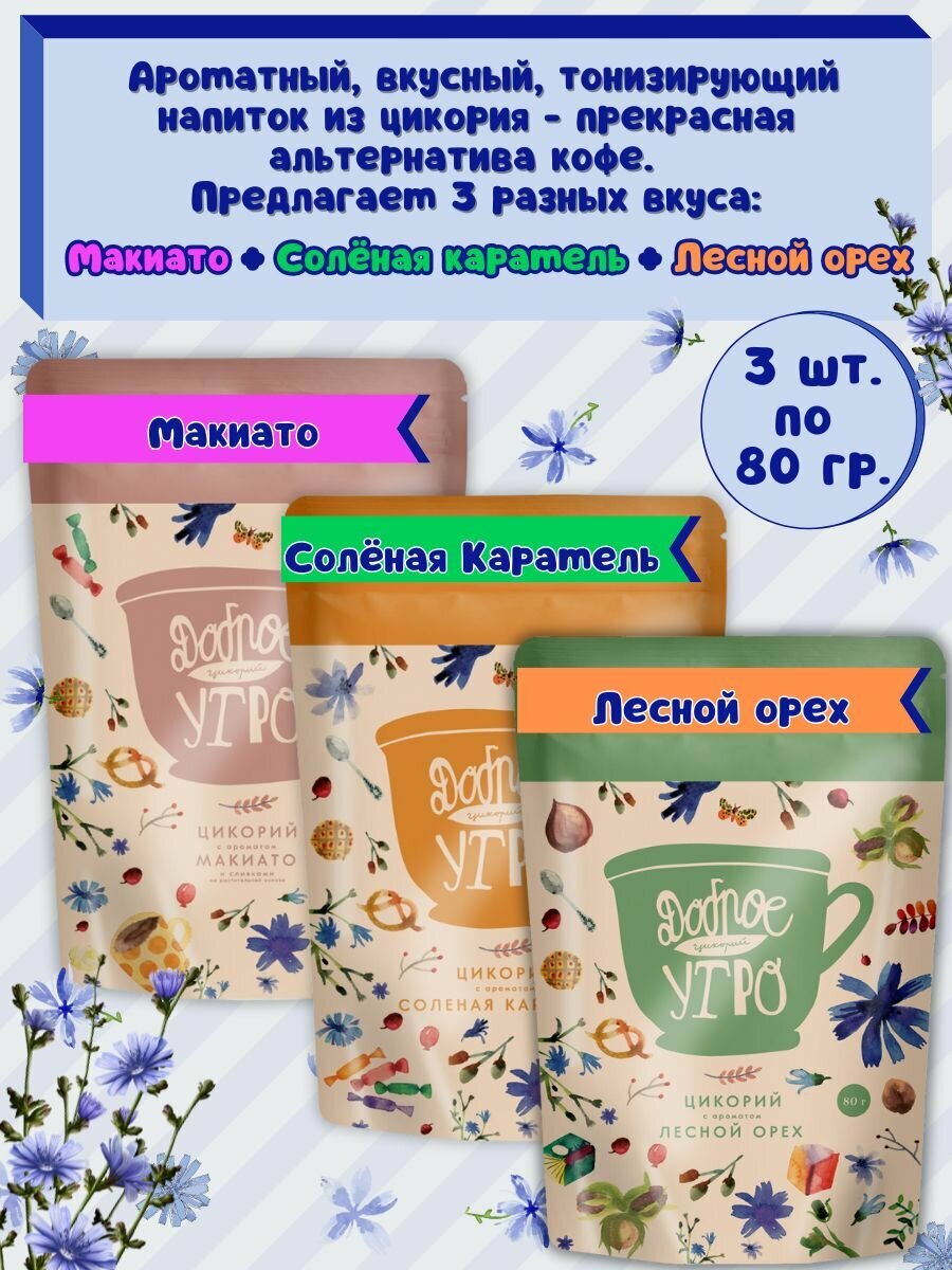 Доброе утро Цикорий натуральный - вкус Макиато, Капучино, Лесной Орех, 3 упаковки по 80гр