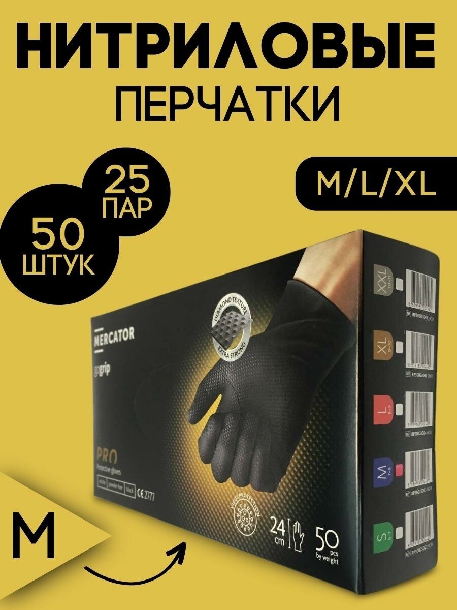 Перчатки особо прочные нитриловые размер М, Меркатор/Mercator GoGrip, защитные черные, 25 пар