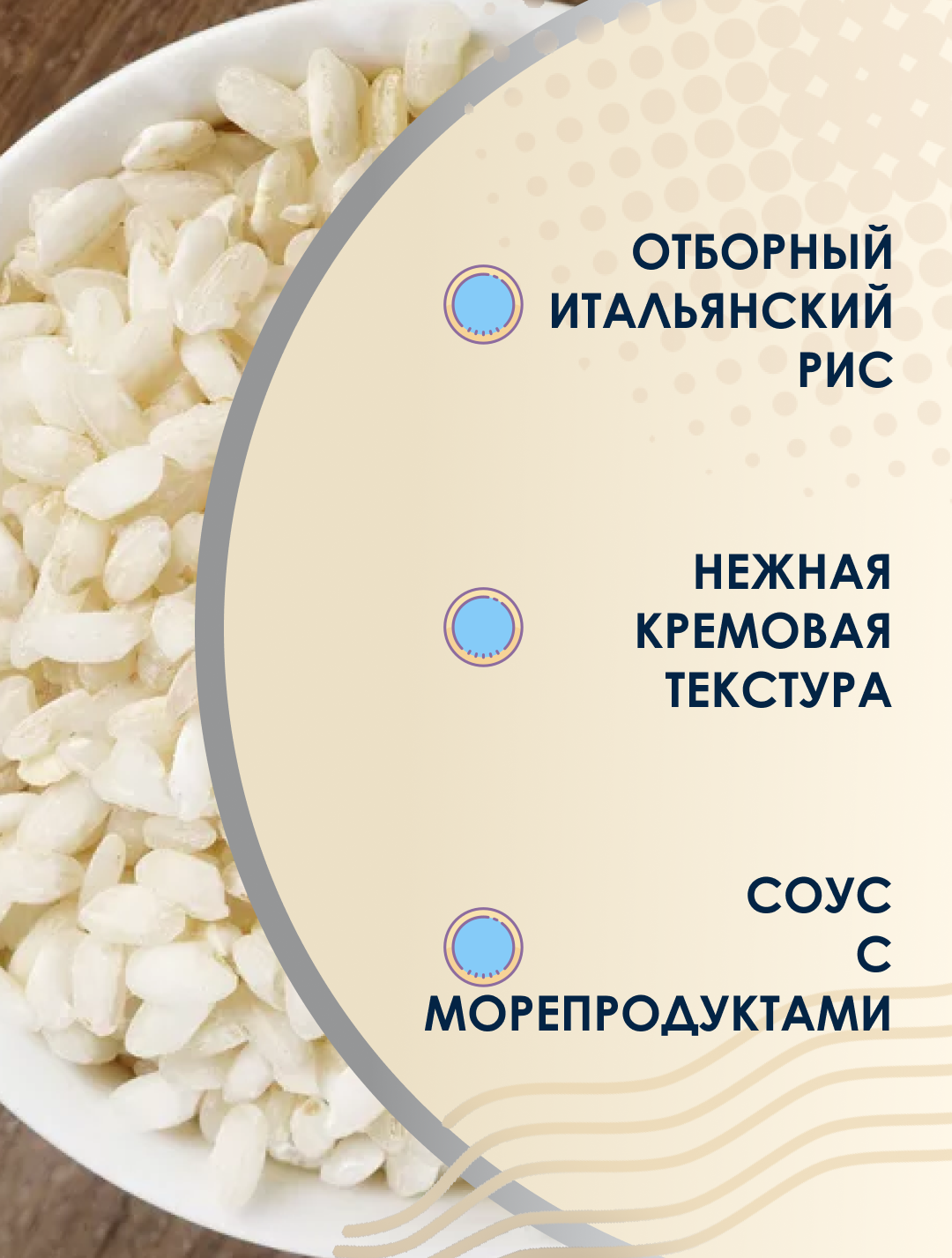 | Состав | пропаренный рис 83%, рисовая мука, белые грибы 3%, натуральный ароматизатор «дрожжевой экстракт»; соль, оливковое масло, каракатица 0,7%, креветки 0,7%, рыбное ассорти (моллюски, соль), моллюски 0,4%, сухое молоко, петрушка 0,2%, лук, чеснок |