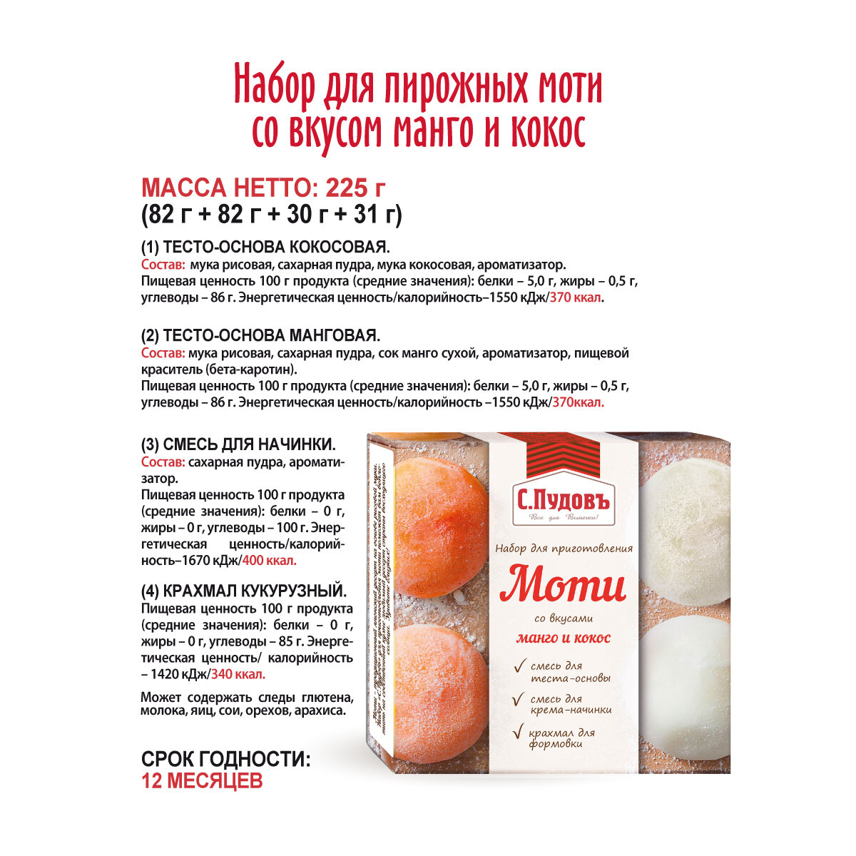Набор для приготовления пирожных "Моти со вкусом манго-кокос" С.Пудовъ, 225 г