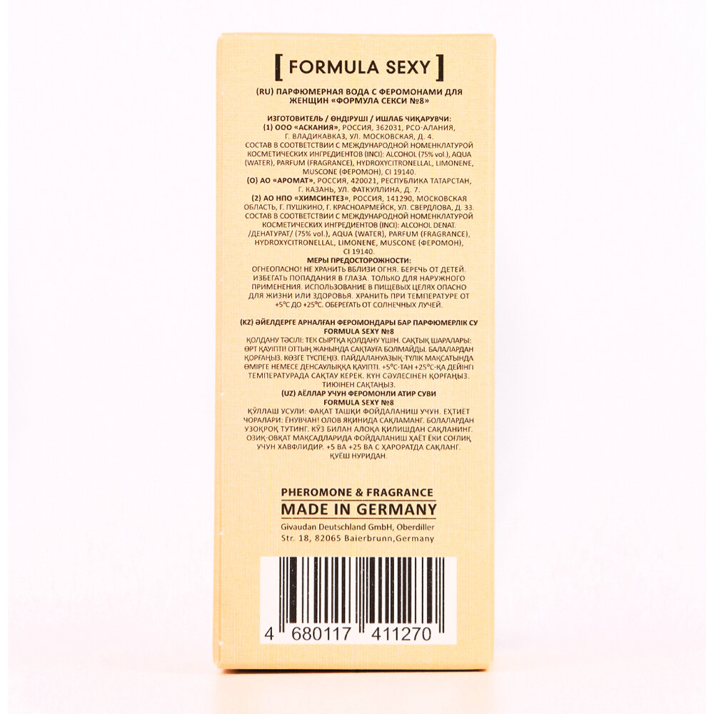 | Состав | Парфюмерная вода c феромонами для женщин «Formula Sexy №8». Состав в соответствии с международной номенклатурой косметических ингредиентов (inci): alcohol (75% vol.), aqua (water), parfum (fragrance), hydroxycitronellal, limonene, muscone (феромон), CI 19140. |
