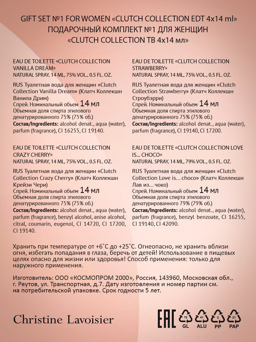 | Состав набора | Туалетная вода женская Clutch Collection Crazy Cherry 14 мл; Clutch Collection Love is... choco 14 мл; Clutch Collection Strawberry 14 мл; Clutch Collection Vanilla Dream 14 мл |