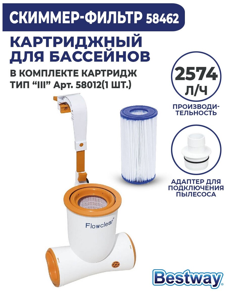 | Комплектация | Фильтровальная установка Bestway 58462 Картридж Bestway 58012 (III) Скиммерная корзина Инструкция. |