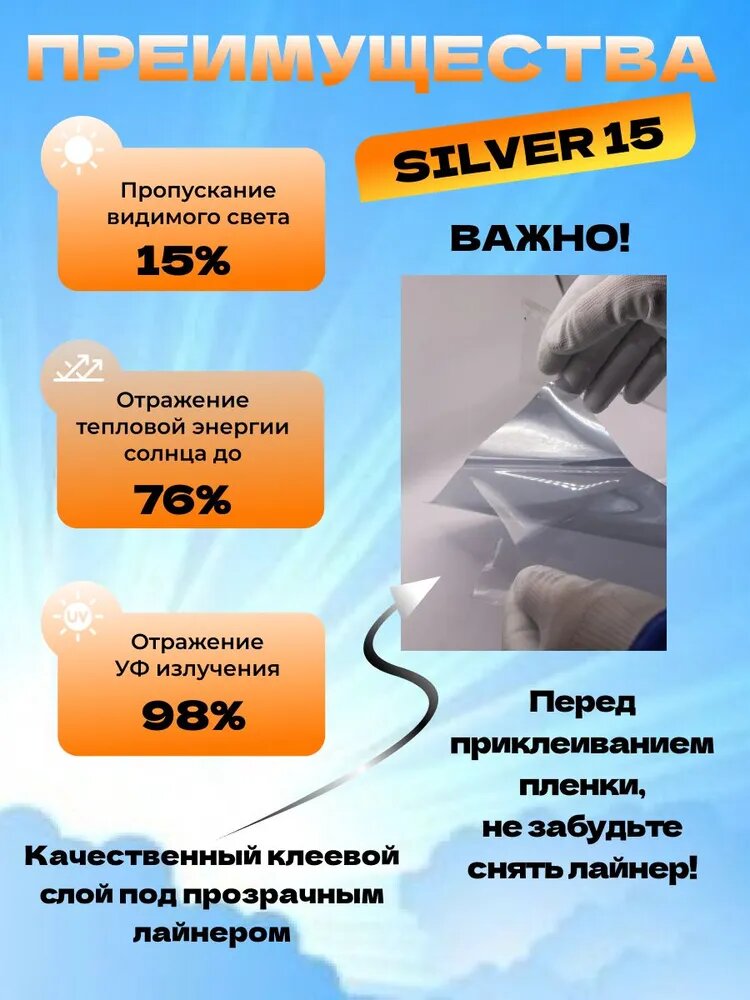 Зеркальная солнцезащитная пленка Silver 15, 152х100 см