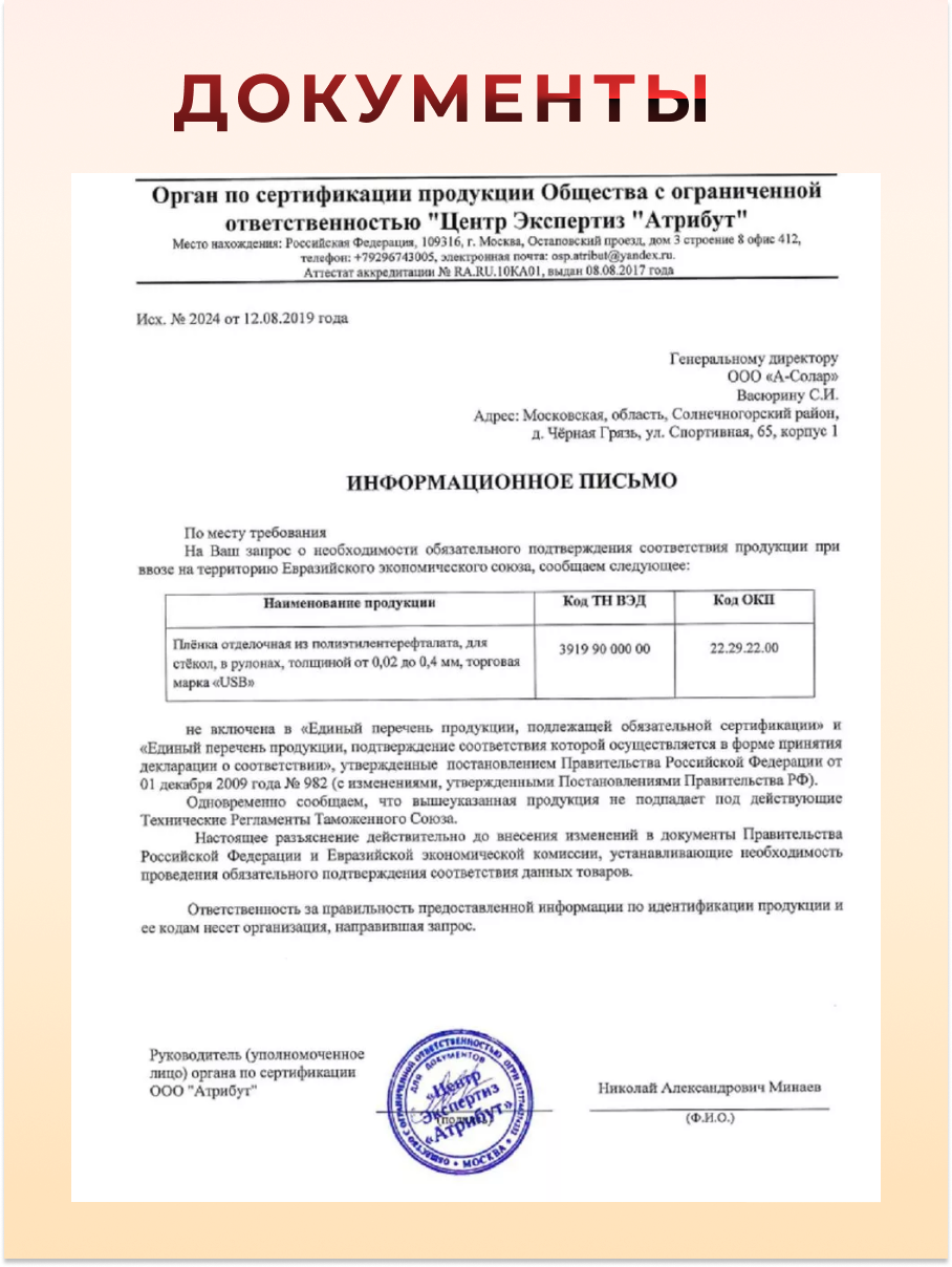 | Дополнительная информация | отражение энергии солнца 63%; отражение УФ излучения в 98%; пропускание видимого света в 16%; толщина 42 мкм; защита от царапин |