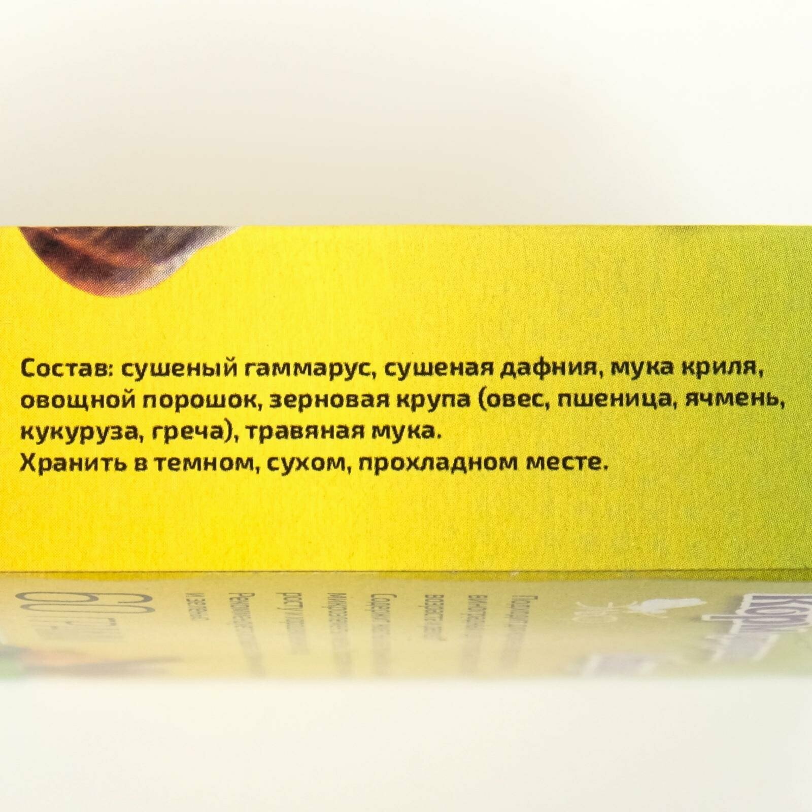 | Ингредиенты | Сушеный гаммарус, Сушеная дафния, Мука криля, Овощной порошок, Овес, Пшеница, Ячмень, Кукуруза, Греча, Травяная мука |