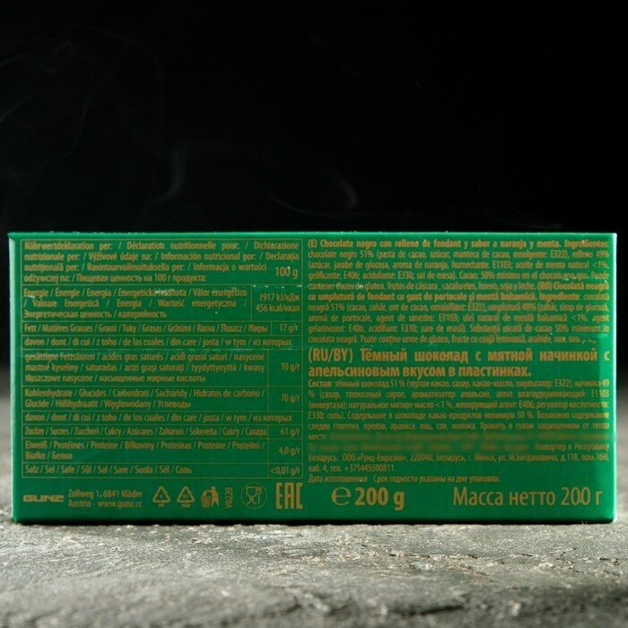 Темный шоколад с мятной начинкой с апельсиновым вкусом в пластинках, 200 г