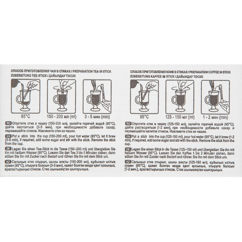 | Способ приготовления | опустите стик в чашку (125-150 мл), залейте горячей водой (95°C), дайте настояться (1-2 мин.), при необходимости добавьте сахар, перемешайте стиком |