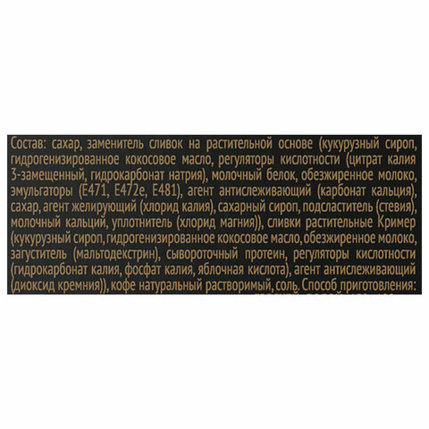| Состав | сахар; заменитель сливок на растительной основе; кофе натуральный растворимый; ароматизатор карамель; соль |