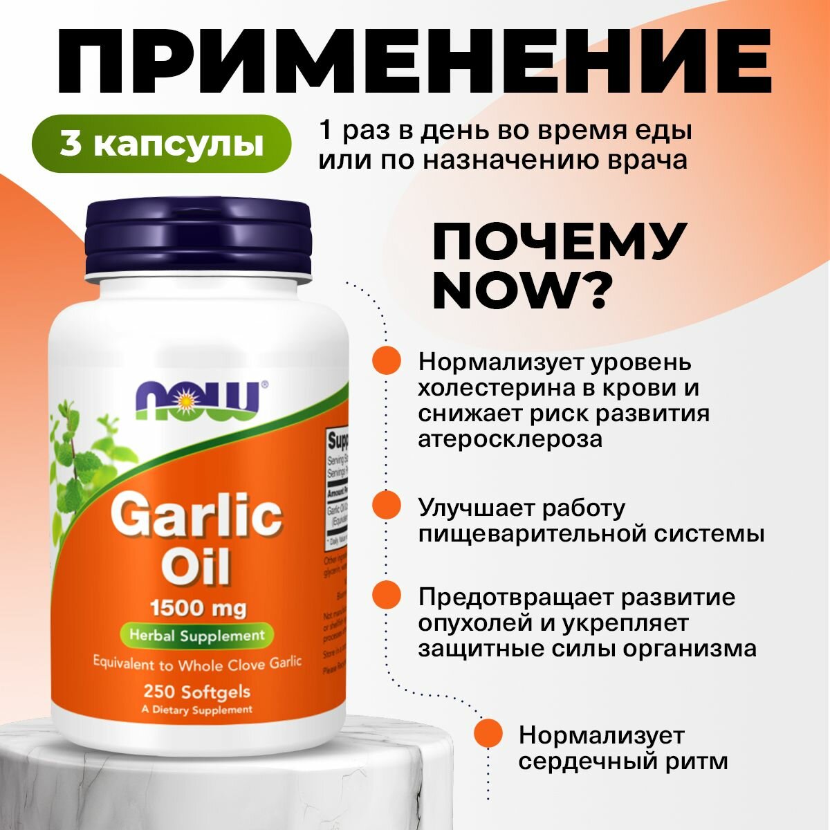 | Способ применения и дозы | Now Foods Garlic Oil (Чесночное масло) 1500 мг употребляют во время еды по 3 капсулы. При язвенной болезни, заболеваниях печени и почек, геморрое перед приемом добавки стоит проконсультироваться с врачом. Противопоказано при эпилепсии. |
