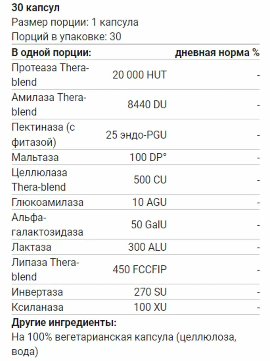 | Состав | В одной порции: Протеаза Thera-blend 20 000 HUT Амилаза Thera-blend 8440 DU Пектиназа (с фитазой) 25 эндо-PGU Мальтаза 100 DPº Целлюлаза Thera-blend 500 CU Глюкоамилаза 10 AGU Альфа-галактозидаза 50 GaIU Лактаза 300 ALU Липаза Thera-blend 450 FCCFIP Инвертаза 270 SU Ксиланаза 100 XU Другие ингредиенты: 100% вегетарианская капсула (целлюлоза, вода). |