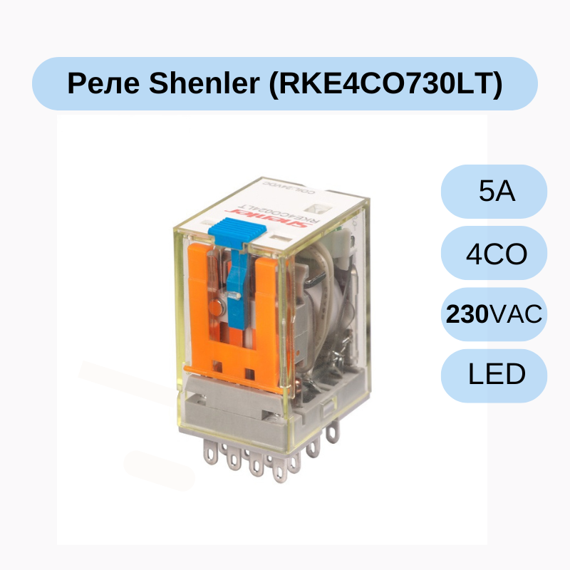 Реле Shenler RKE4CO024LT, 4CO, 5A(250VAC/30VDC), 24VDC, мех. индикация, тест-кнопка с блокировкой, LED