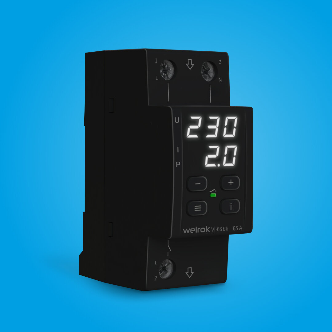 Купить Защитное реле напряжения с контролем тока Welrok VI-63 bk (63 Ампер) на два модуля. Черное