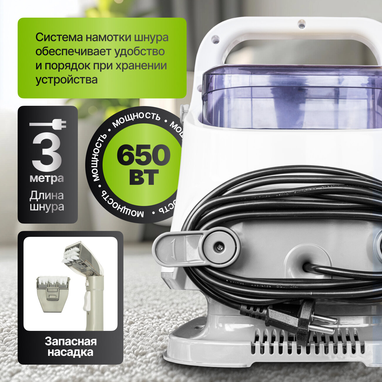 Моющий пылесос KIWI KCC-4325W для химчистки ковров, мягкой мебели, салона авто, мягких игрушек, для всех видов загрязнений