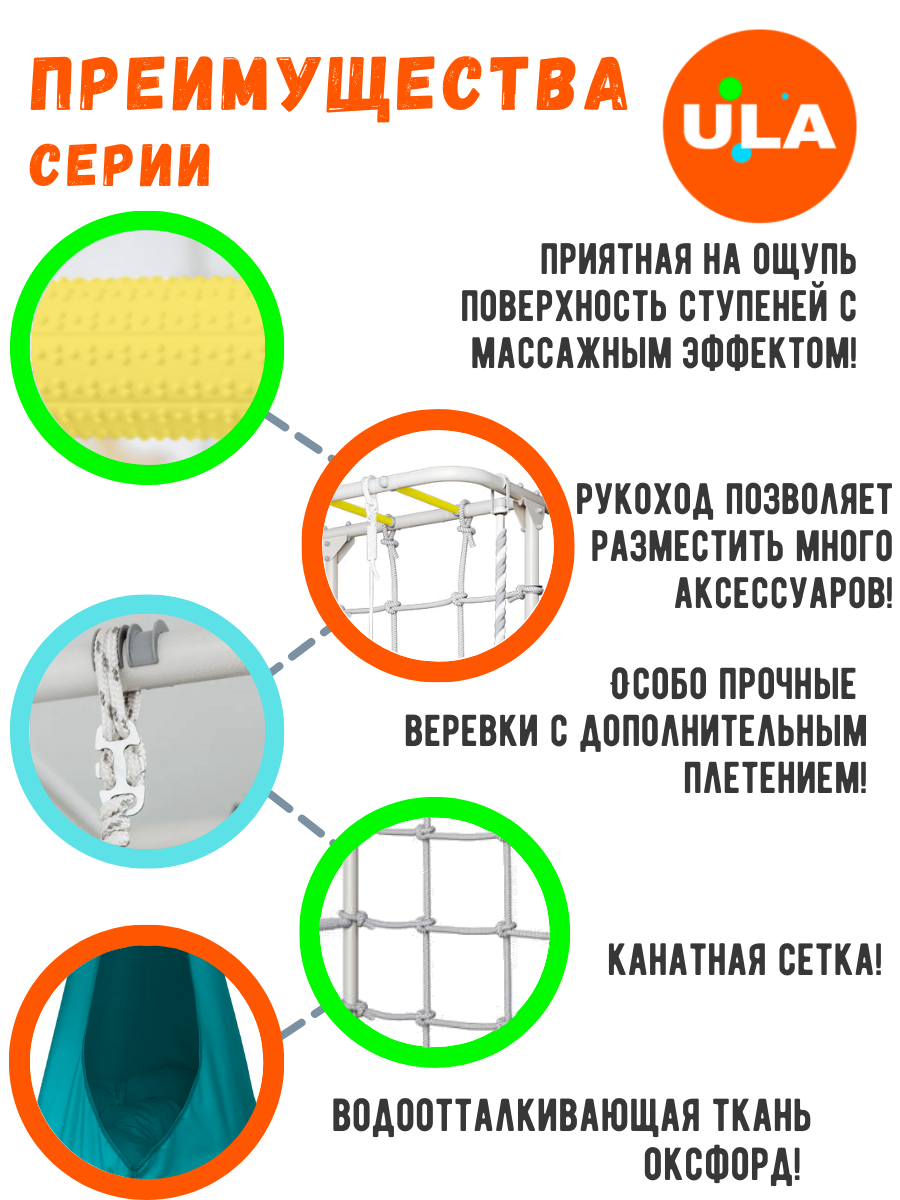 | Комплектация | гамак / гимнастические кольца / канат / рукоход / сетка для лазания / турник-рукоход |