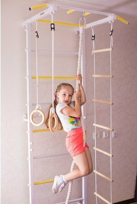 | Подробная комплектация | стенка металлическая с турником 3 хвата, навесные брусья пресс с упором для штанги, пластиковые кольца, канат, веревочная лестница. |