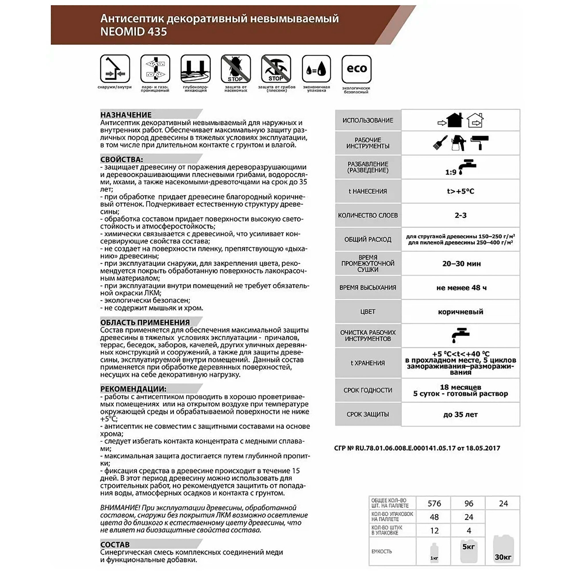 Neomid 435 Eco Невымываемый Антисептик декоративный (коричневый, 5 л)