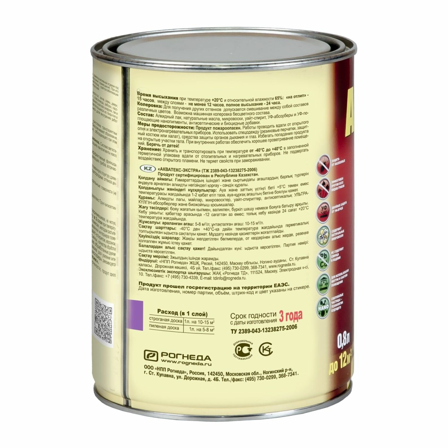 | Дополнительная информация | разбавление допускается, но не более 15% от общей массы состава; межслойная сушка - 12 часов (при t+20+/-2С); хранение и транспортировка: при t от -40С до +40С, не теряет свойств при замораживании; состав: алкидные смолы, натуральное масло, уайт-спирит, натуральный микровоск, высокоэффективные трудновымываемые биоцидные компоненты, светостойкие транспарентные нано-пигменты, УФ-фильтры UVA и UVB-диапазонов, УФ-абсорберы; количество слоев: внутри помещения - 1-2 слоя, снаружи помещения - 2 слоя; расход в один слой: для строганной древесины: 1л на 10-15м2, для пиленной древесины: 1л на 5-8 м2; межслойная сушка - 12 часов; допускается смешивание цветов между собой |