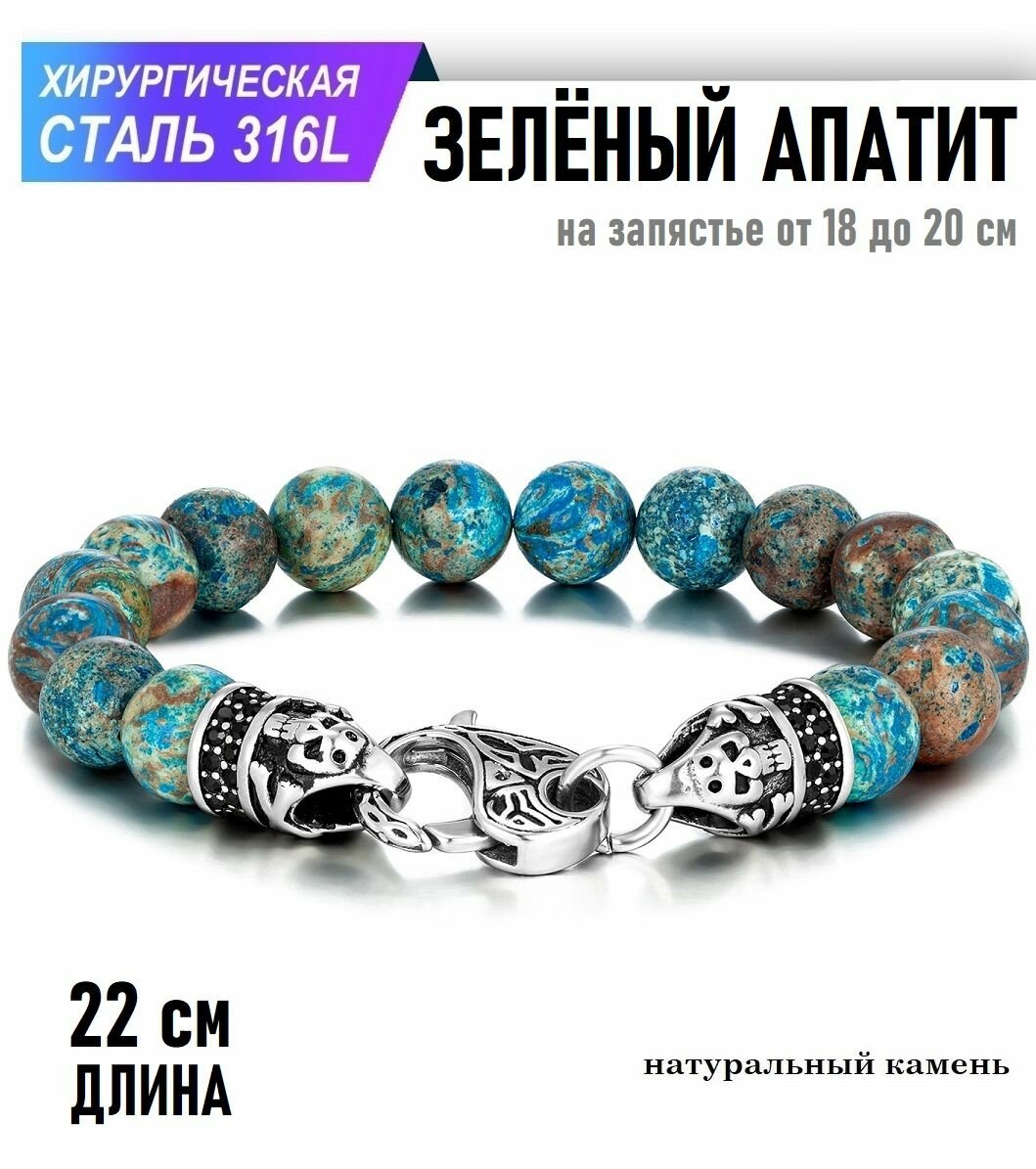 Браслет из зелёного апатита и стали с бусинами 10 мм и чёрными куб.цирконами/ 22 см