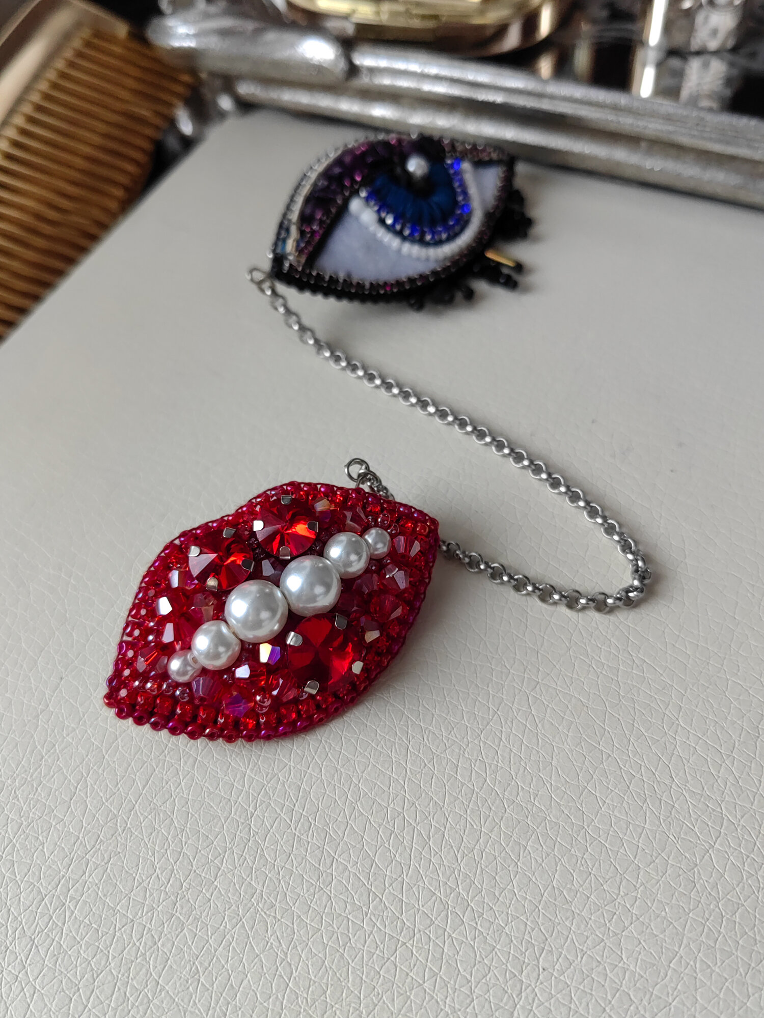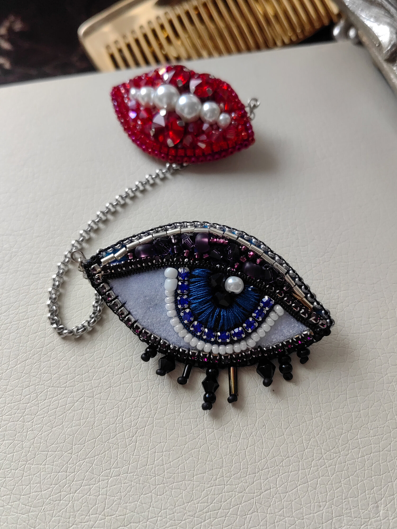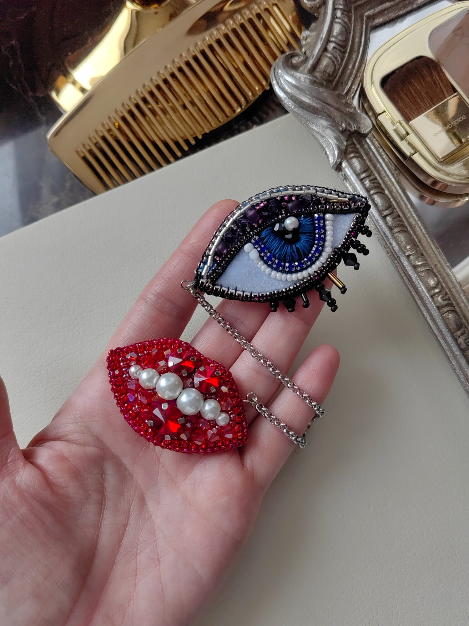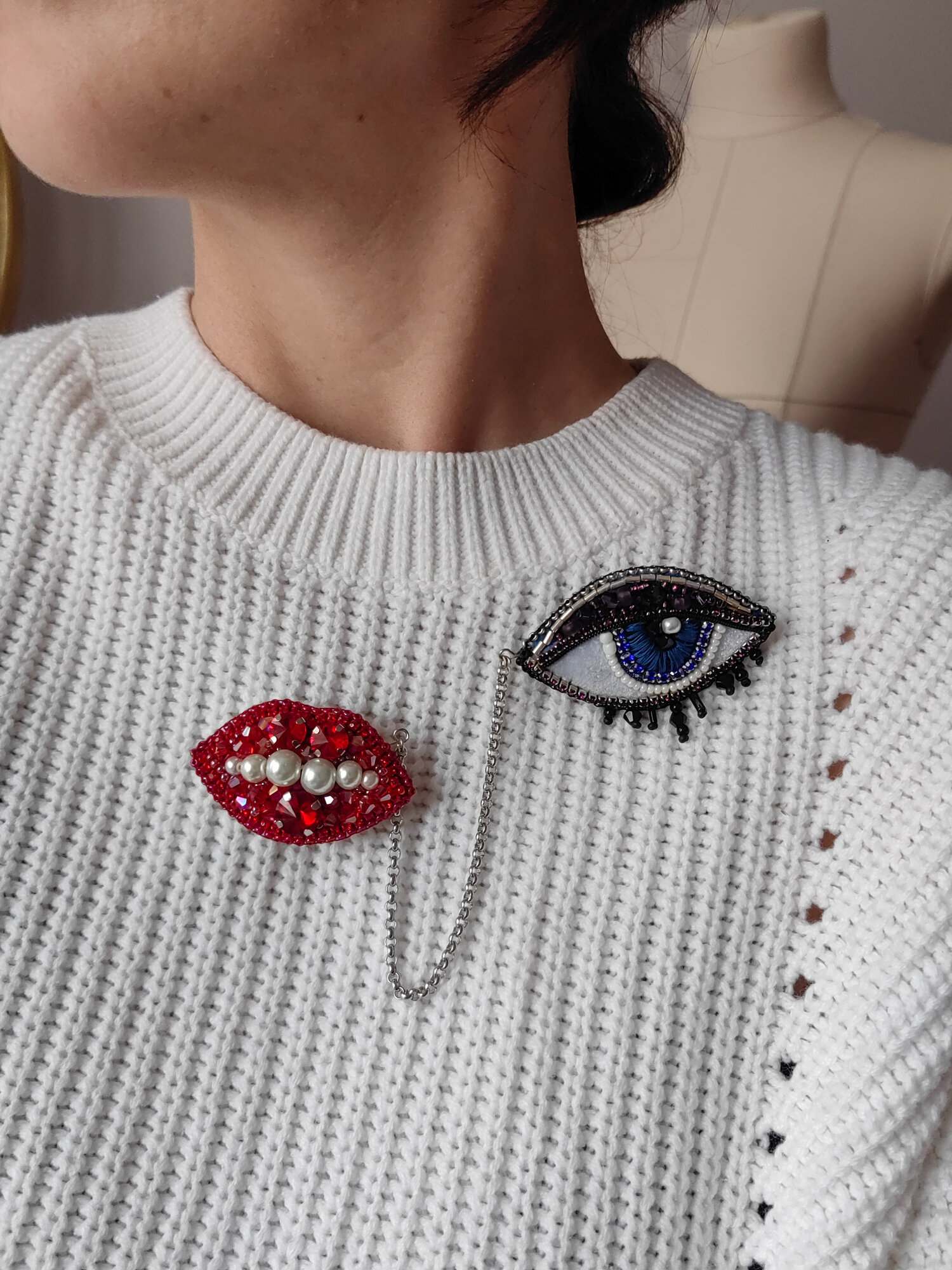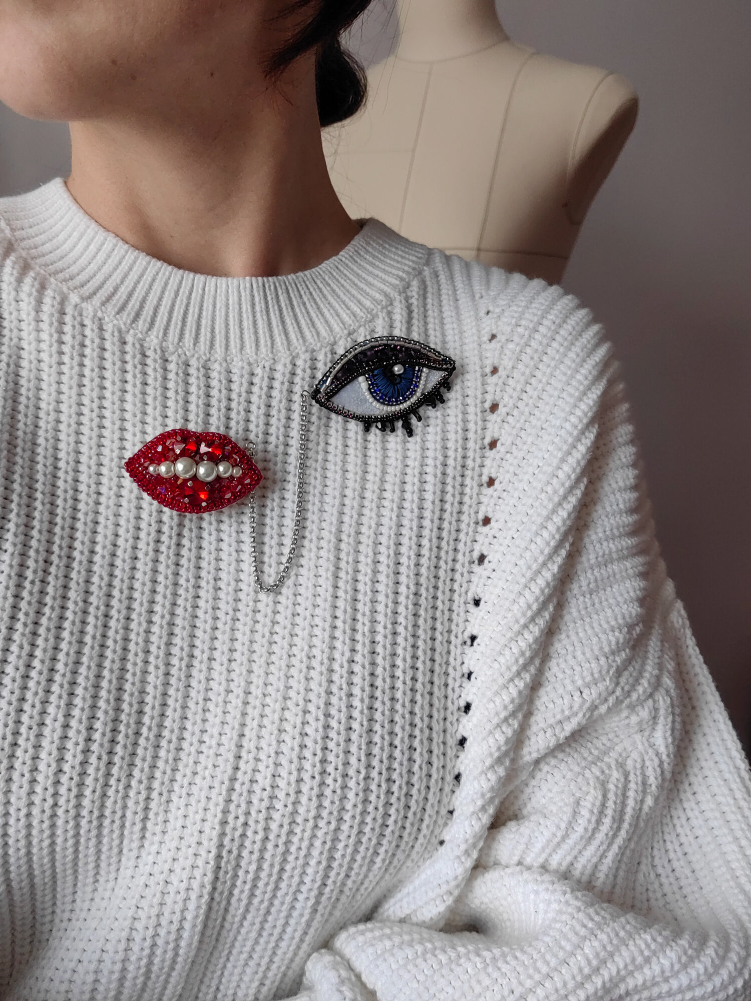 Брошь глаз губы. Парные броши. Сет из двух брошей. Украшения бижутерия ручной работы из бисера. Стильные модные необычные броши на пиджак.