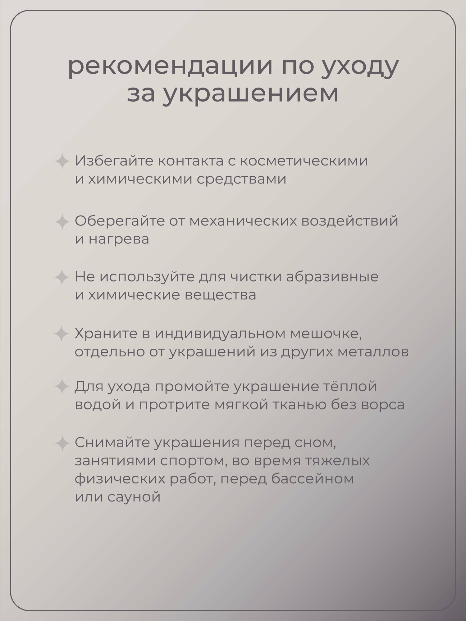 | Комплектация | Кольцо, бирка, пломба, пакет zip-lock, подарочный мешочек |