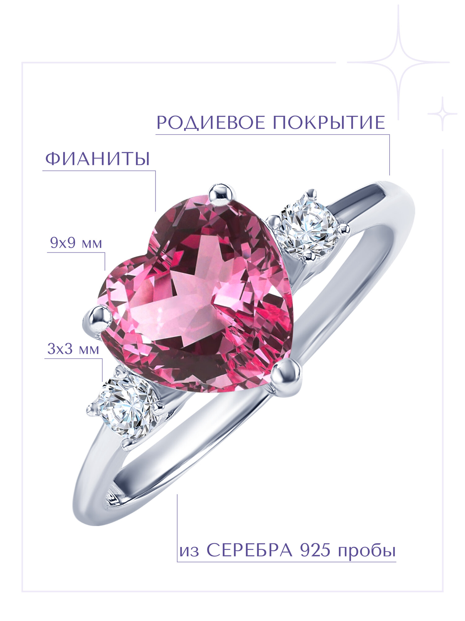 | Дополнительная информация | Ширина кольца составляет 1 мм. Размер розового фианита: 9*9 мм. Диаметр белых фианитов: 3 мм. |