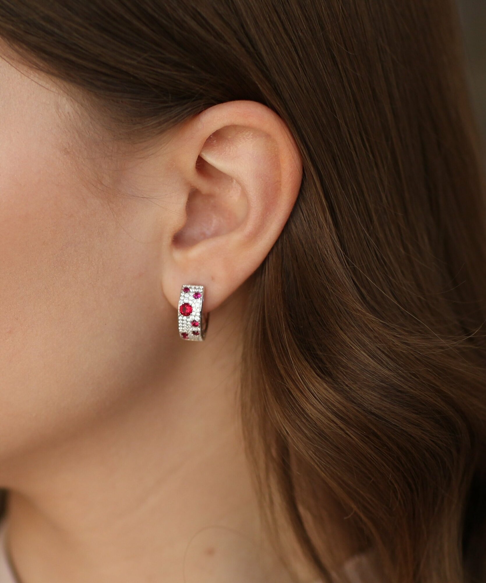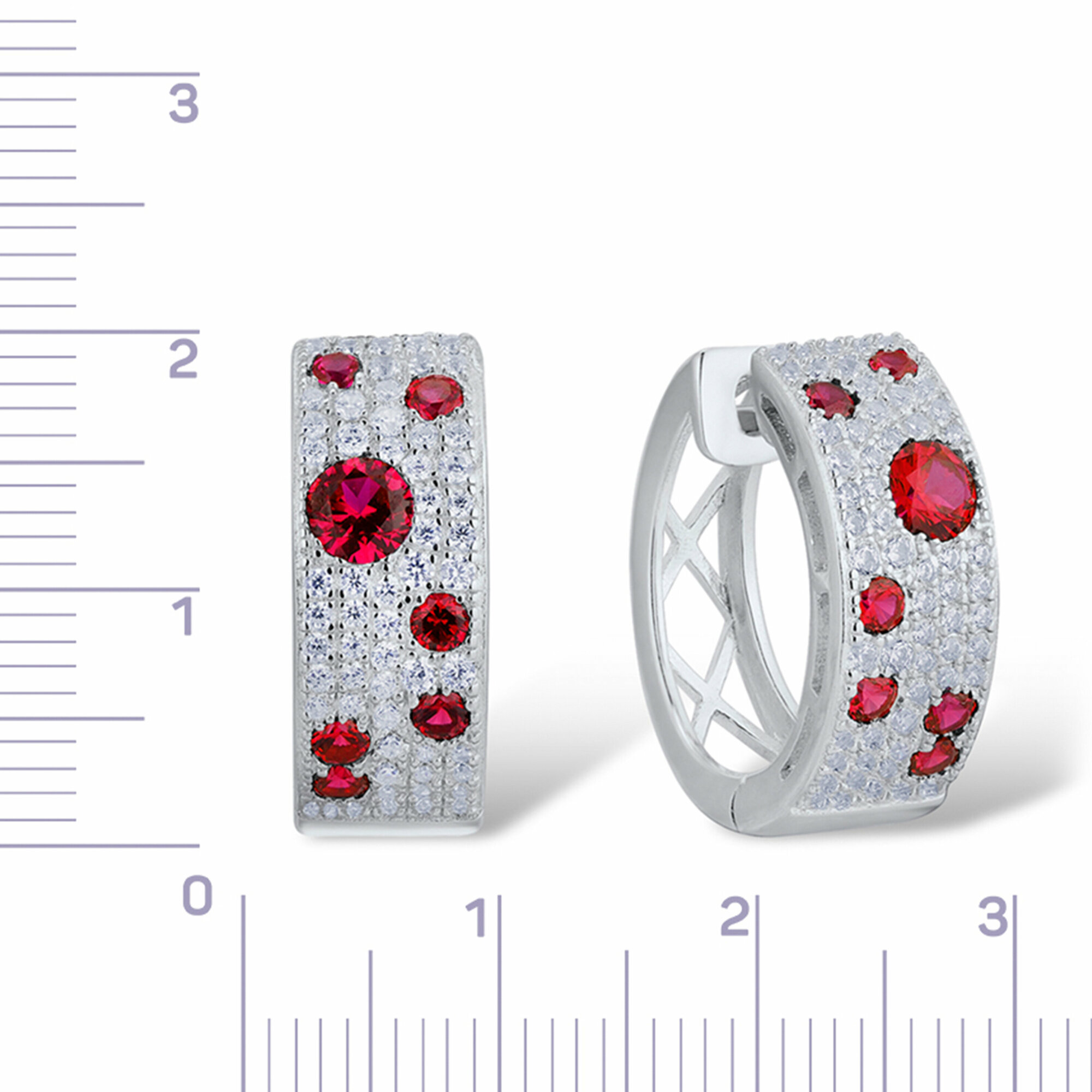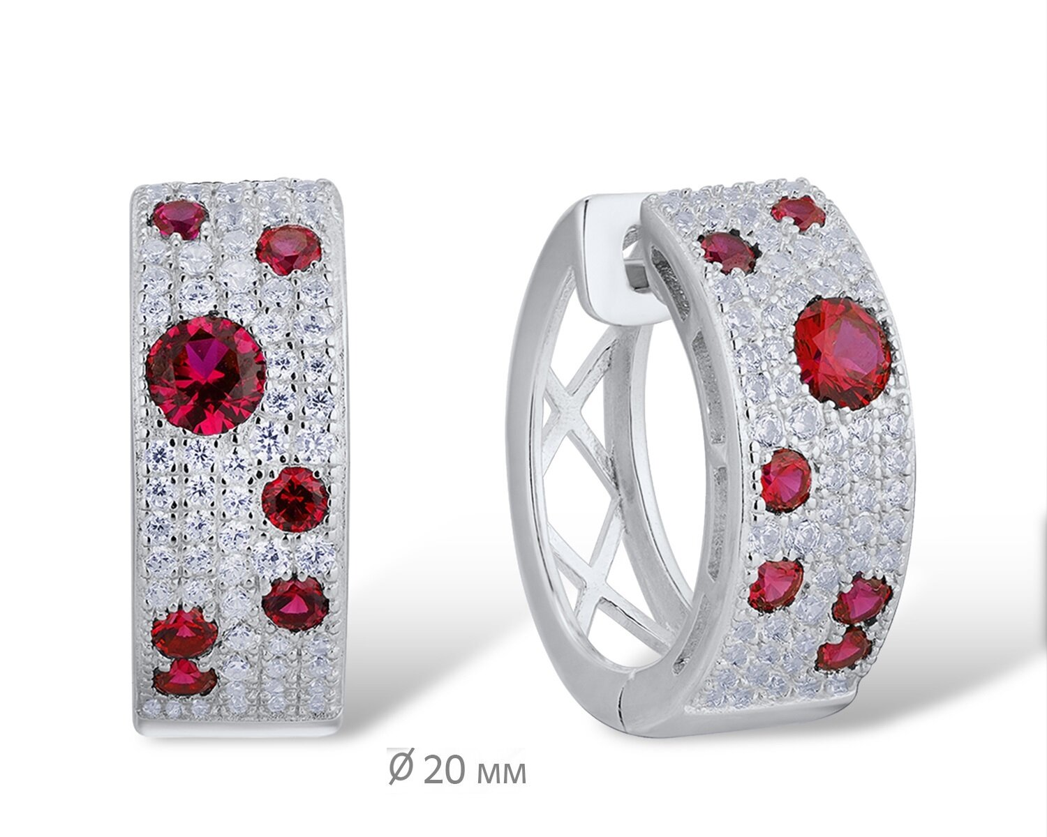 Серьги кольца (конго) из родированного серебра с кубическим циркрнием и нанорубином диаметр 20 мм VALTERA