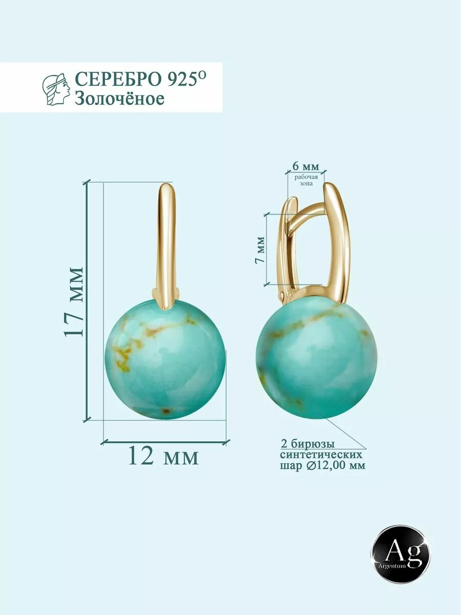 Серьги двусторонние Argentum, серебро, 925 проба, золочение, бирюза синтетическая, размер 12 мм, длина 1.7 см, , бирюза интересное: