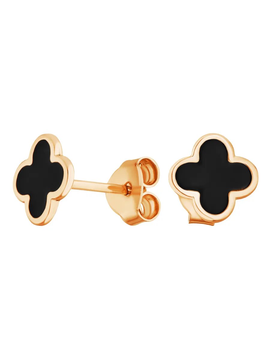Серьги-пусеты серебряные 925 пробы в позолоте Клевер, сережки-гвоздики Четырехлистник с черной эмалью, ср.вес изделия 0,9 гр, арт. 2027944/91пчг