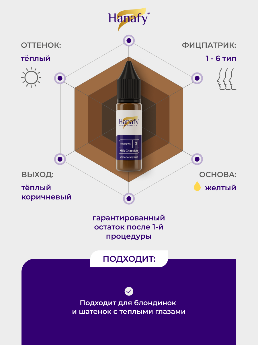 СохранитьПигмент №3 Milk Chocolate для татуажа и перманентного макияжа бровей, цвет теплый коричневый Ханафи, 15 мл интересное:
