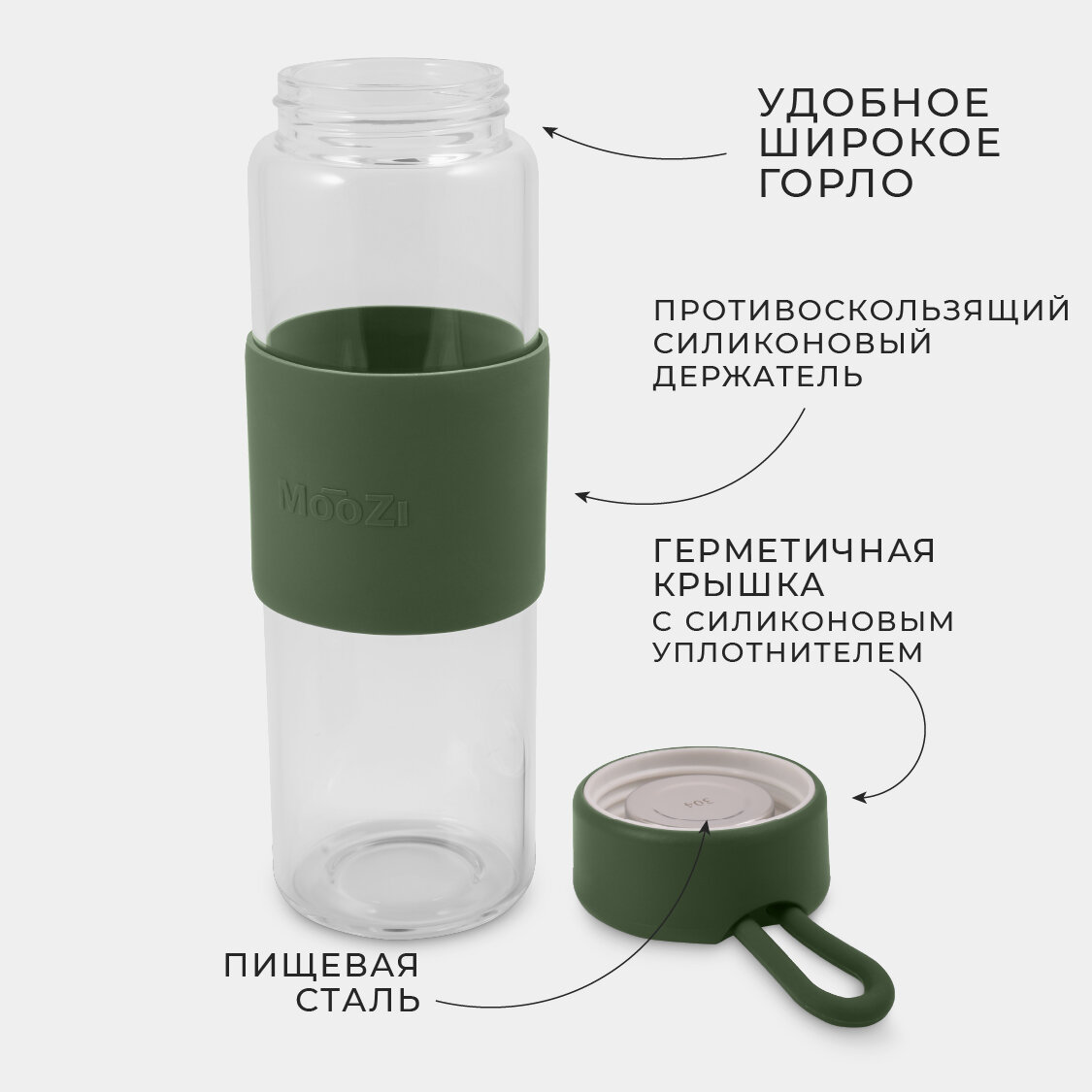 Купить Стеклянная бутылка MOOZI, для воды, 520мл, зеленая, с герметичной крышкой