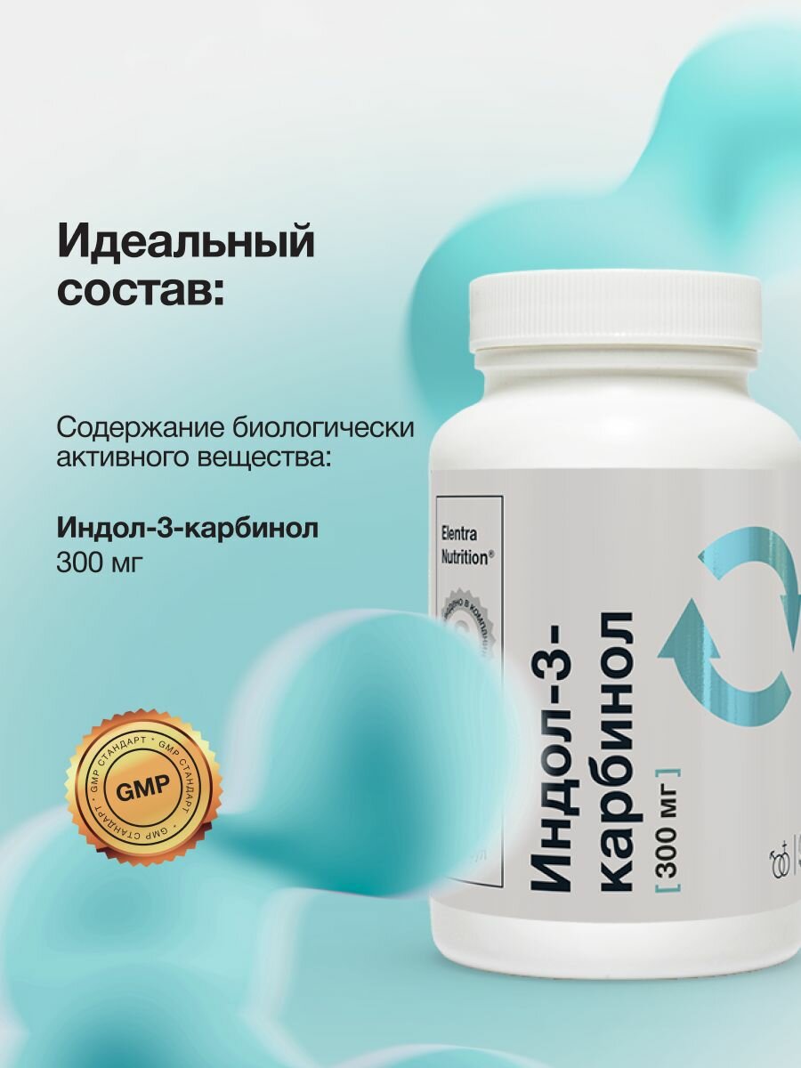 | Состав | Индол-3-карбинол (экстракт брокколи), микрокристаллическая целлюлоза (Е460i, носитель), стеариновая кислота (Е570 носитель), L-лейцин, диоксид кремния (Е551 агент антислеживающий), оболочка капсулы (гидроксипропилметилцеллюлоза (Е464 носитель). |