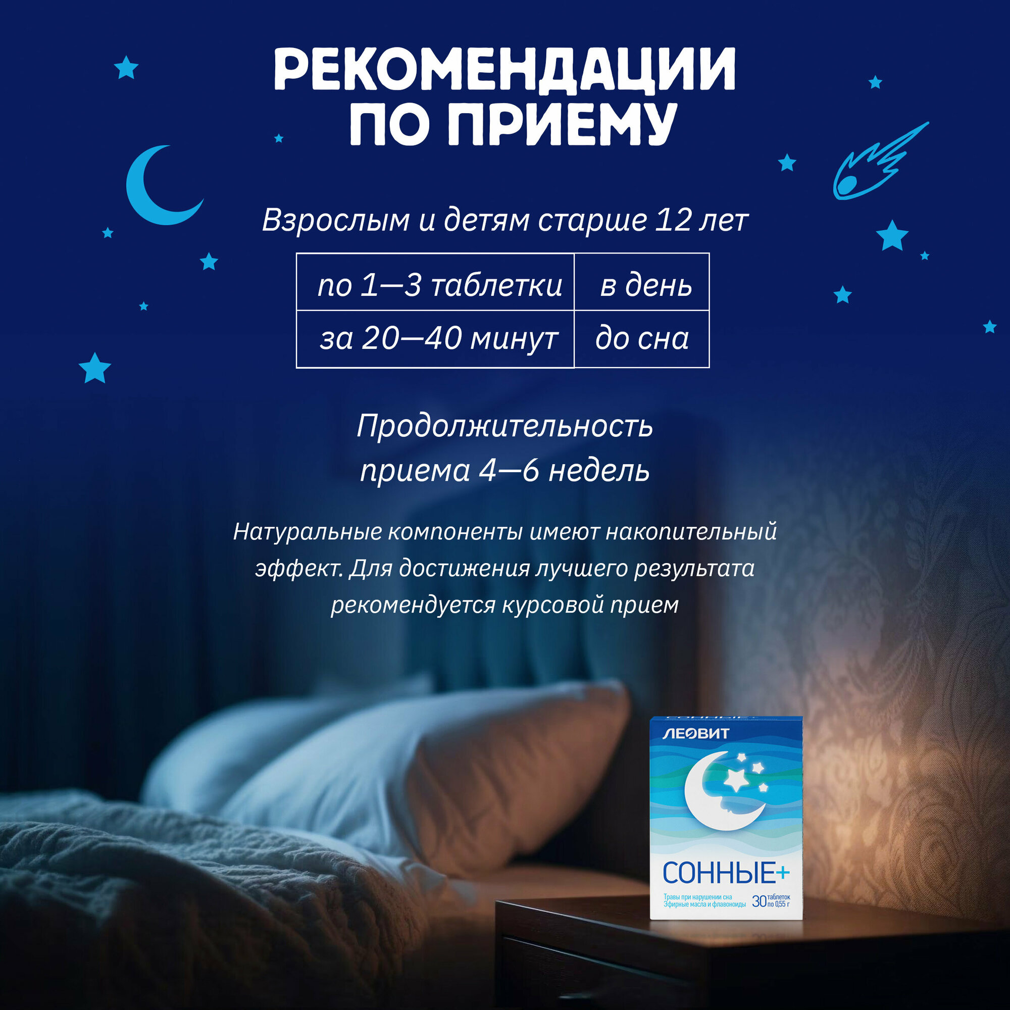| Способ применения и дозы | Взрослым: по 1 - 3 таблетки в день за 20 - 40 минут до сна. Продолжительность приема: 4 - 6 недель. При необходимости прием можно повторить. |
